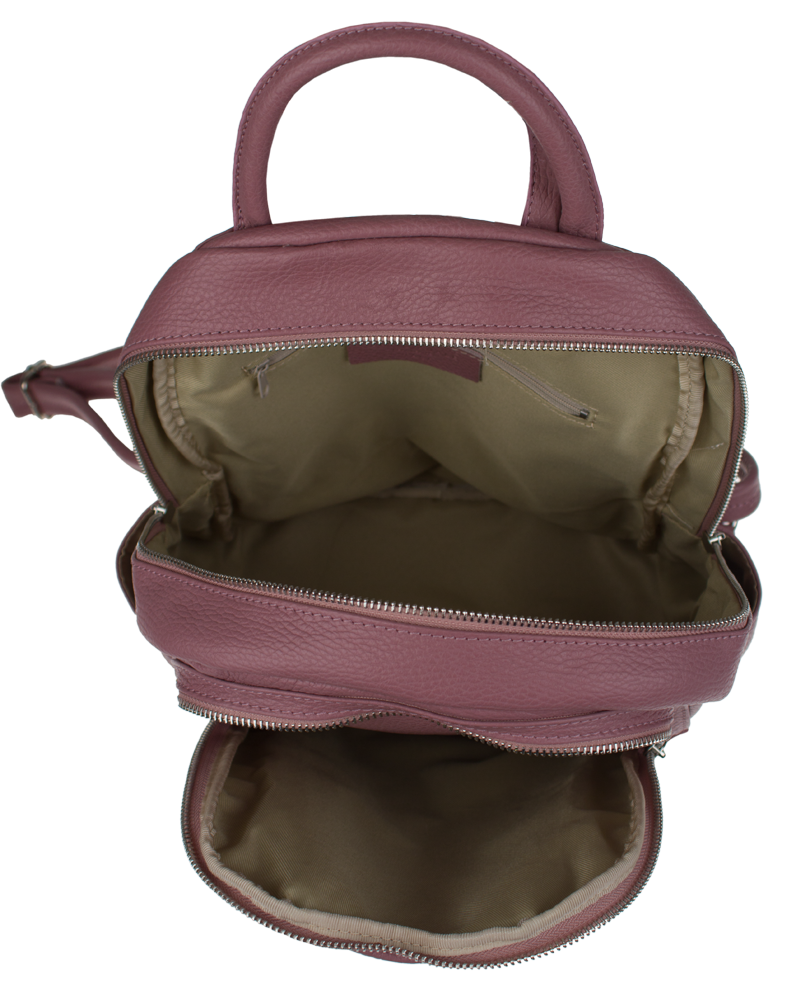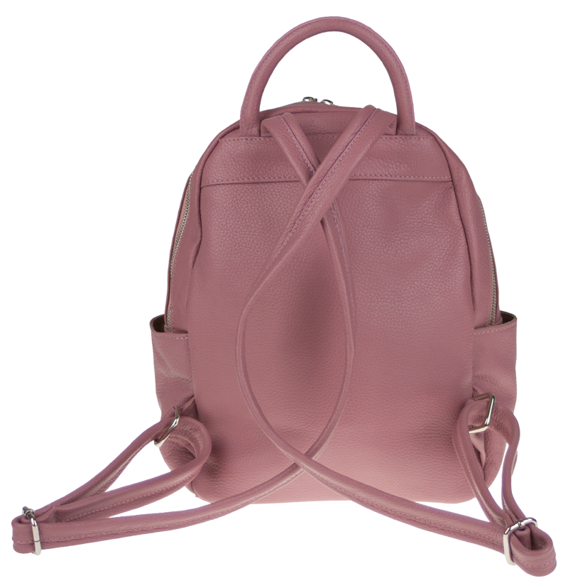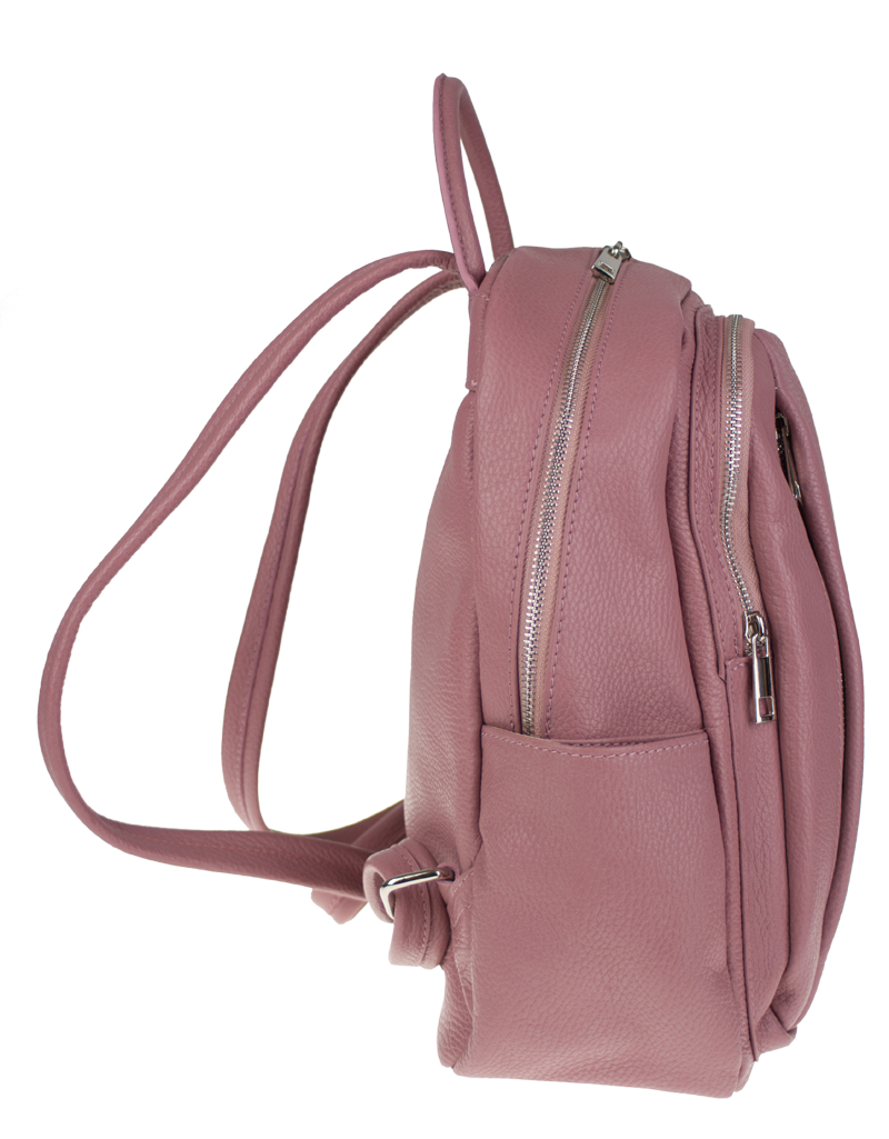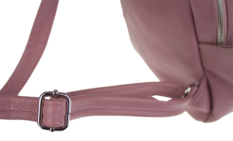 Růžový kožený batůžek, se stříbrnými kovovými doplňky a zipy. Další barevné varianty batůžku Ilaria naleznete zde.