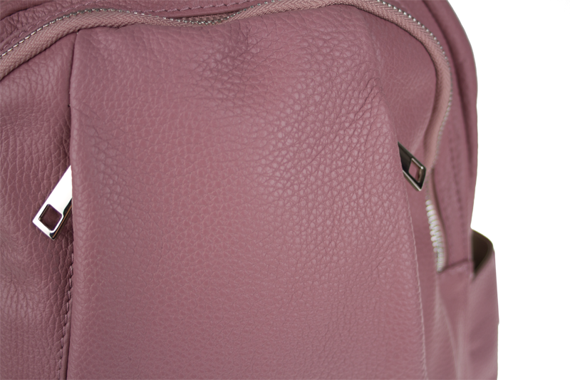 Růžový kožený batůžek, se stříbrnými kovovými doplňky a zipy.