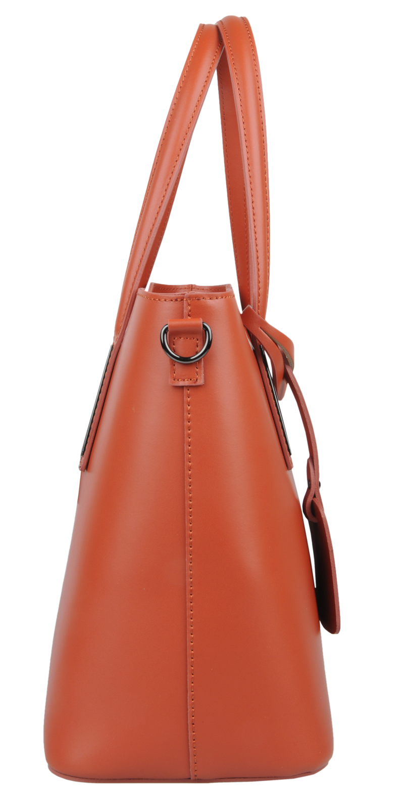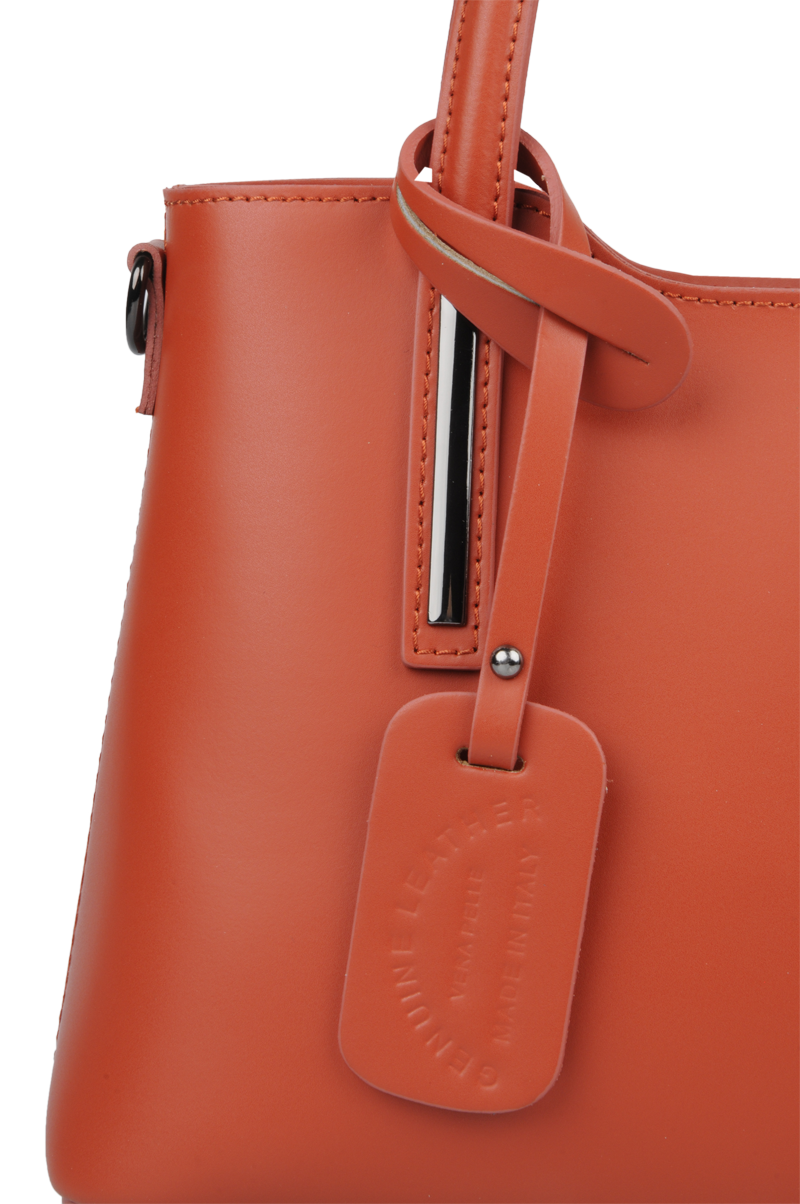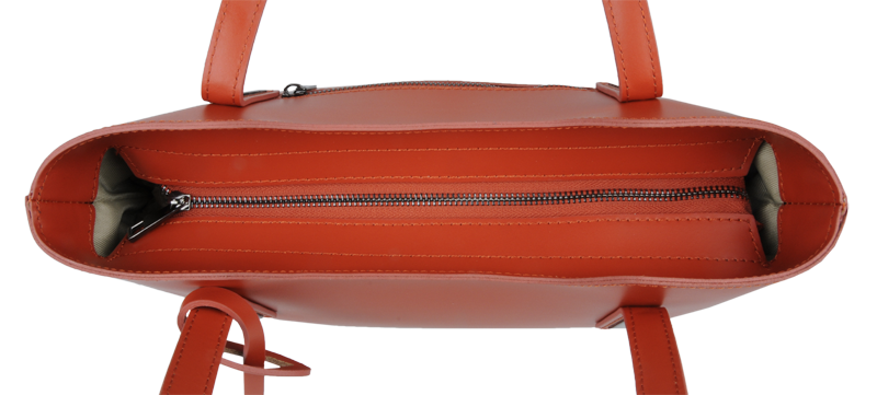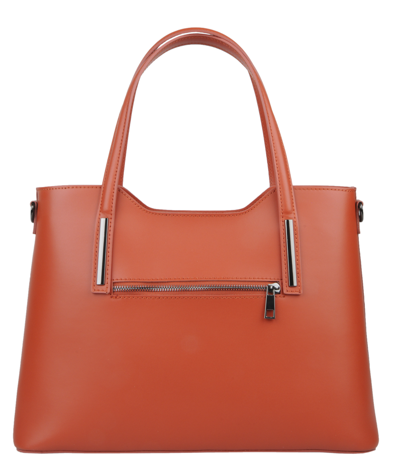 Praktická kabelka v oranžovém provedení pro každodenní nošení vyrobená z pevné pravé kůže. Nosí se v ruce nebo na rameni. Kabelka je uzavíratelná na zip. Součástí balení je přídavný popruh – cca 107 cm v plné délce. Uvnitř kabelky najdeme přepážku uprostřed, která zároveň slouží jako kapsa na zip, a na bočních stěnách pak kapsu na zip a 2 malé kapsy vhodné např. pro mobil a peněženku.