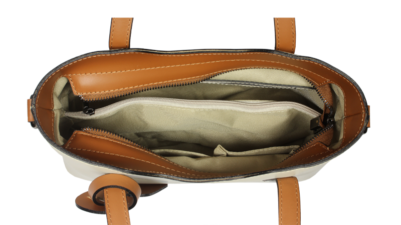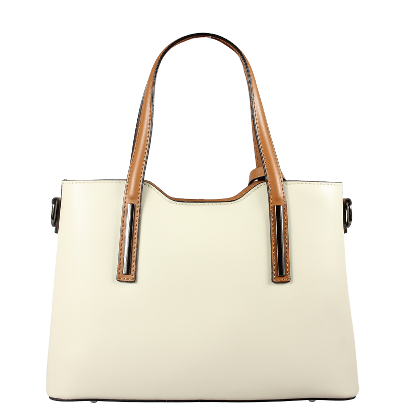 Praktická kabelka v béžovém provedení pro každodenní nošení vyrobená z pevné pravé kůže. Nosí se v ruce nebo na rameni. Kabelka je uzavíratelná na zip. Součástí balení je přídavný popruh – cca 107 cm v plné délce. Uvnitř kabelky najdeme přepážku uprostřed, která zároveň slouží jako kapsa na zip, a na bočních stěnách pak kapsu na zip a 2 malé kapsy vhodné např. pro mobil a peněženku.