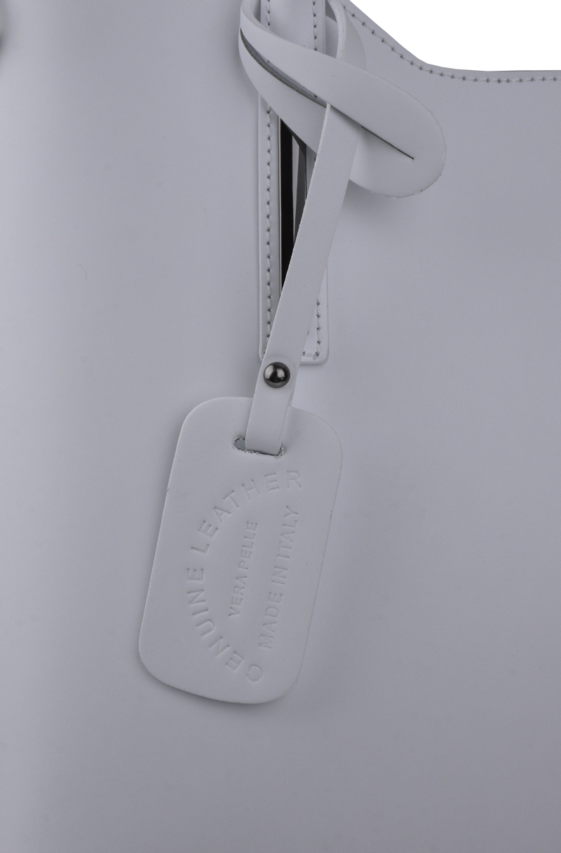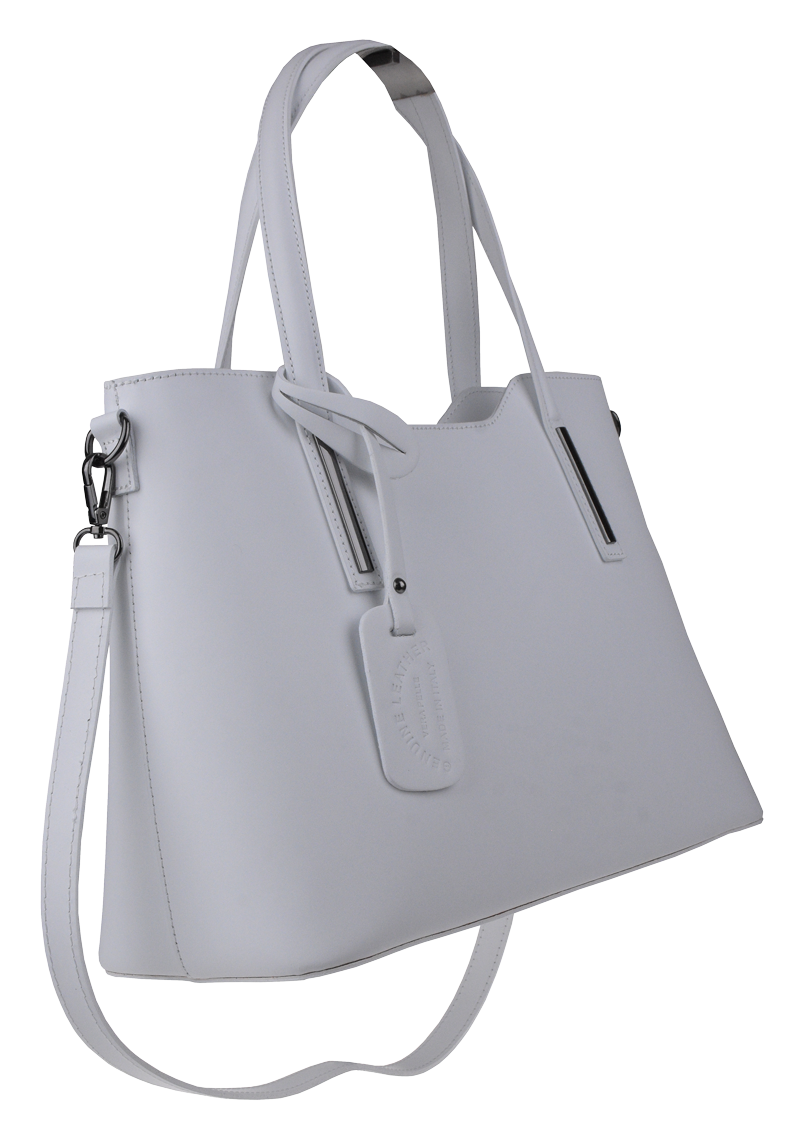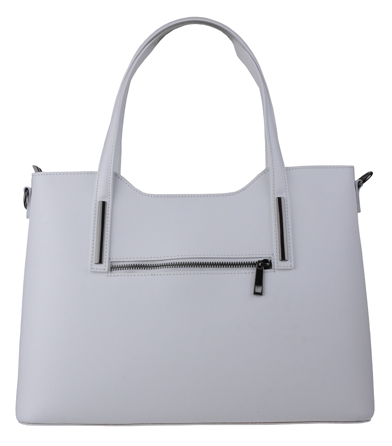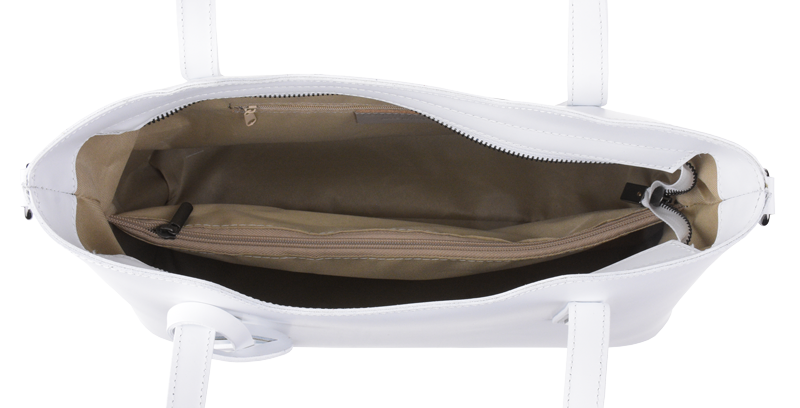 Praktická kabelka v bílém provedení pro každodenní nošení vyrobená z pevné pravé kůže. Nosí se v ruce nebo na rameni. Kabelka je uzavíratelná na zip. Součástí balení je přídavný popruh – cca 107 cm v plné délce. Uvnitř kabelky najdeme přepážku uprostřed, která zároveň slouží jako kapsa na zip, a na bočních stěnách pak kapsu na zip a 2 malé kapsy vhodné např. pro mobil a peněženku.