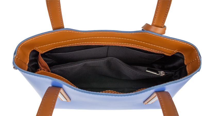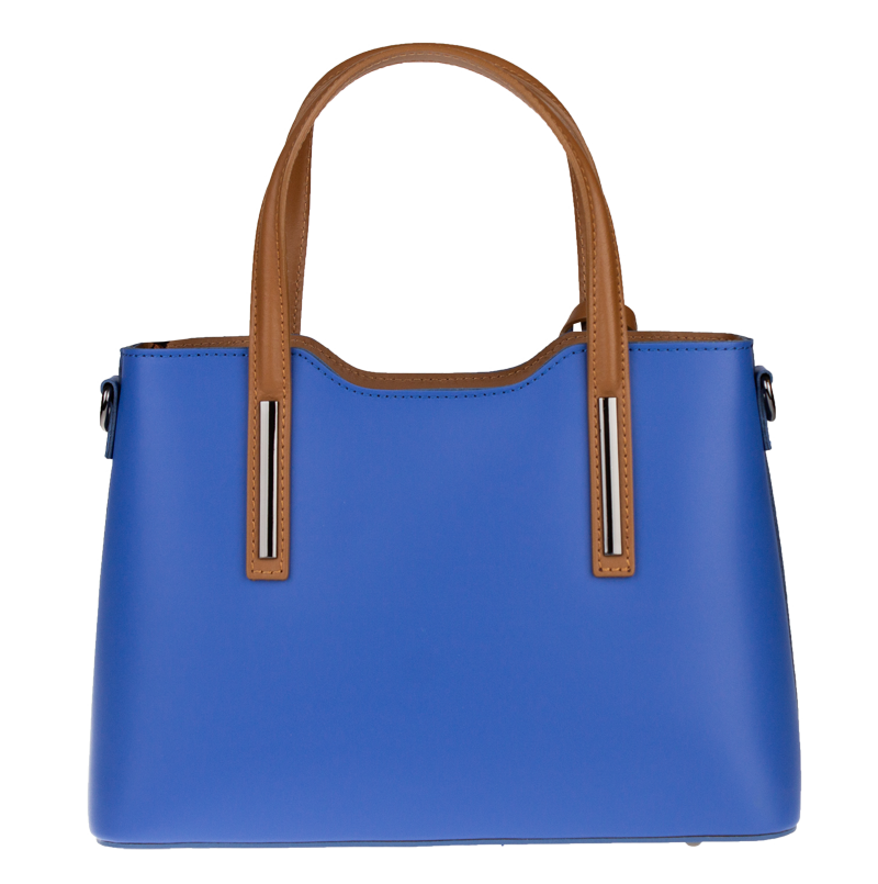 Praktická kabelka v modrém provedení pro každodenní nošení vyrobená z pevné pravé kůže. Nosí se v ruce nebo na rameni. Kabelka je uzavíratelná na zip. Součástí balení je přídavný popruh – cca 107 cm v plné délce. Uvnitř kabelky najdeme přepážku uprostřed, která zároveň slouží jako kapsa na zip, a na bočních stěnách pak kapsu na zip a 2 malé kapsy vhodné např. pro mobil a peněženku.