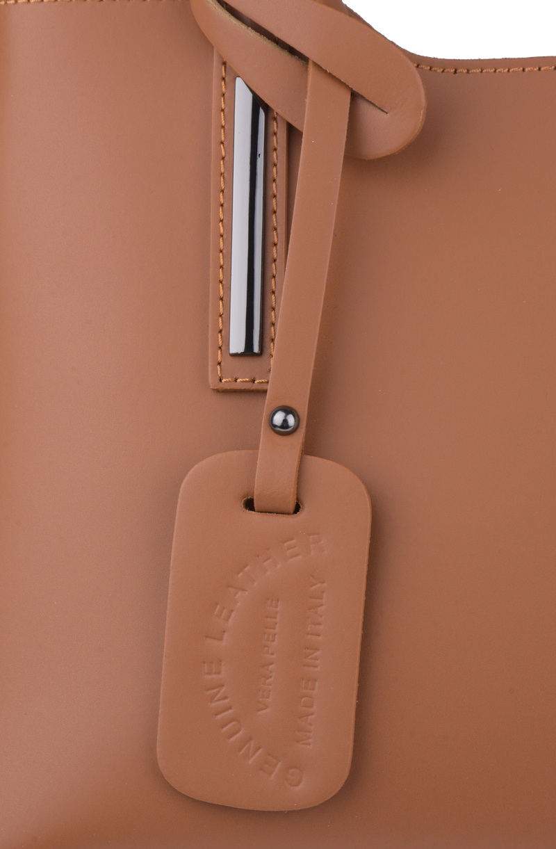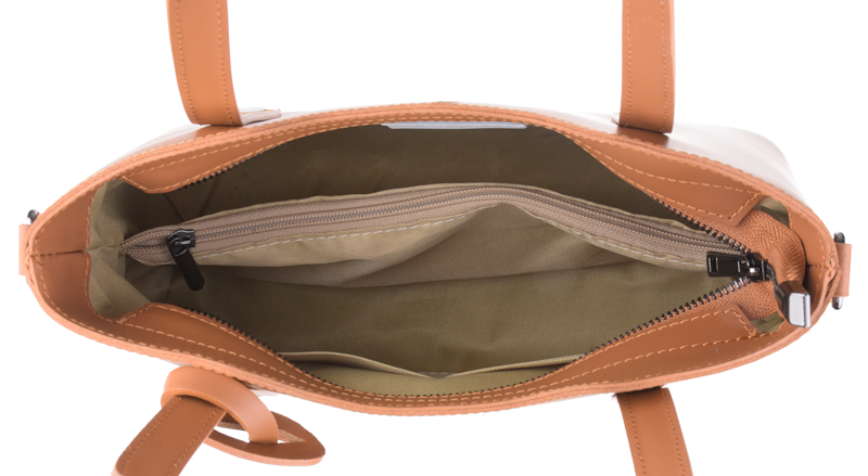 Praktická kabelka v camel provedení pro každodenní nošení vyrobená z pevné pravé kůže. Nosí se v ruce nebo na rameni. Kabelka je uzavíratelná na zip. Součástí balení je přídavný popruh – cca 107 cm v plné délce. Uvnitř kabelky najdeme přepážku uprostřed, která zároveň slouží jako kapsa na zip, a na bočních stěnách pak kapsu na zip a 2 malé kapsy vhodné např. pro mobil a peněženku.
