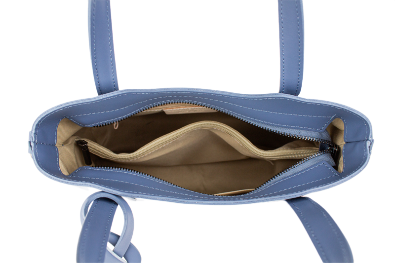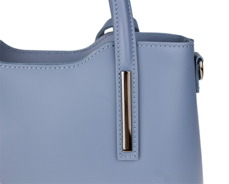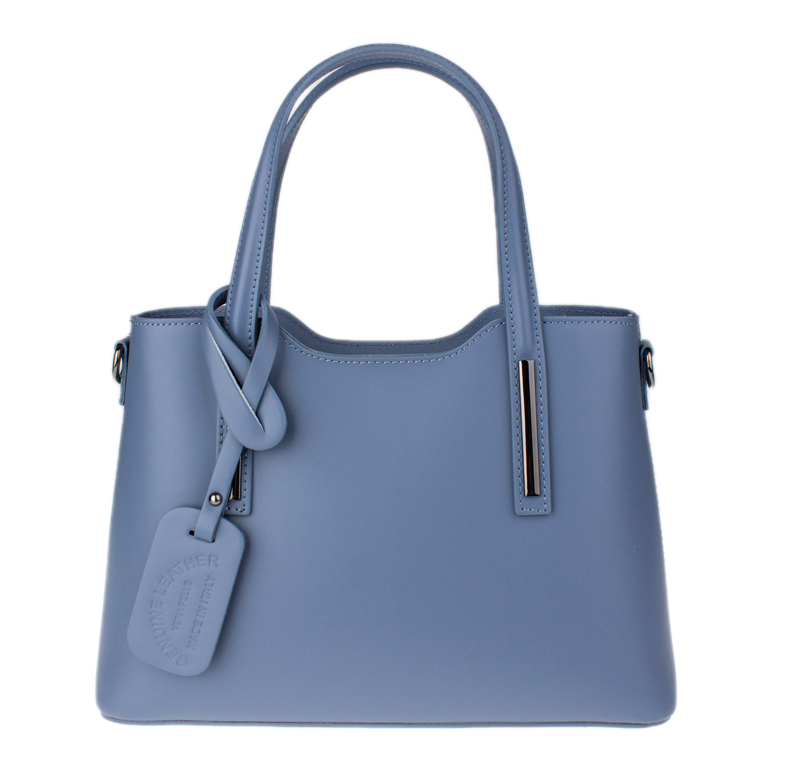 Praktická kabelka v modrém provedení pro každodenní nošení vyrobená z pevné pravé kůže. Nosí se v ruce nebo na rameni. Kabelka je uzavíratelná na zip. Součástí balení je přídavný popruh – cca 107 cm v plné délce. Uvnitř kabelky najdeme přepážku uprostřed, která zároveň slouží jako kapsa na zip, a na bočních stěnách pak kapsu na zip a 2 malé kapsy vhodné např. pro mobil a peněženku.