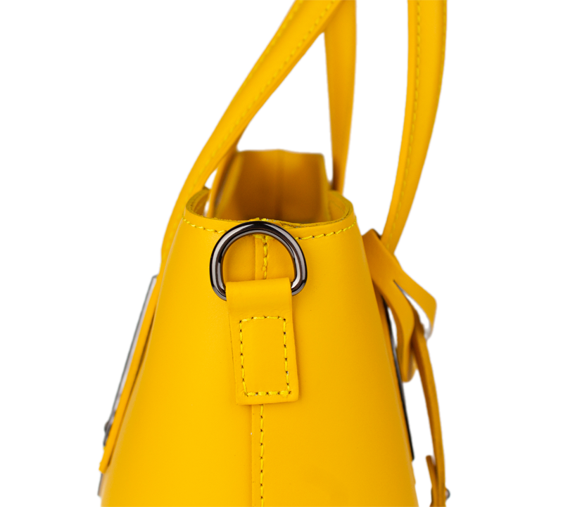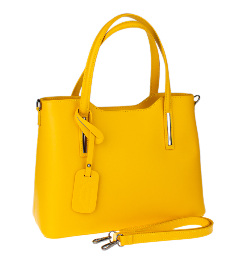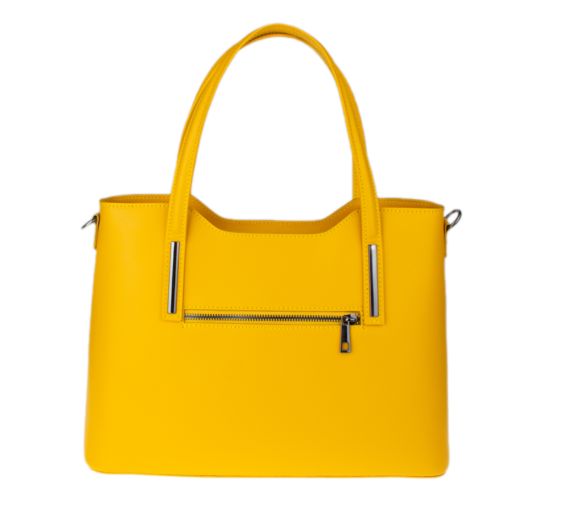 Praktická kabelka ve žlutém provedení pro každodenní nošení vyrobená z pevné pravé kůže. Nosí se v ruce nebo na rameni. Kabelka je uzavíratelná na zip. Součástí balení je přídavný popruh – cca 107 cm v plné délce. Uvnitř kabelky najdeme přepážku uprostřed, která zároveň slouží jako kapsa na zip, a na bočních stěnách pak kapsu na zip a 2 malé kapsy vhodné např. pro mobil a peněženku.