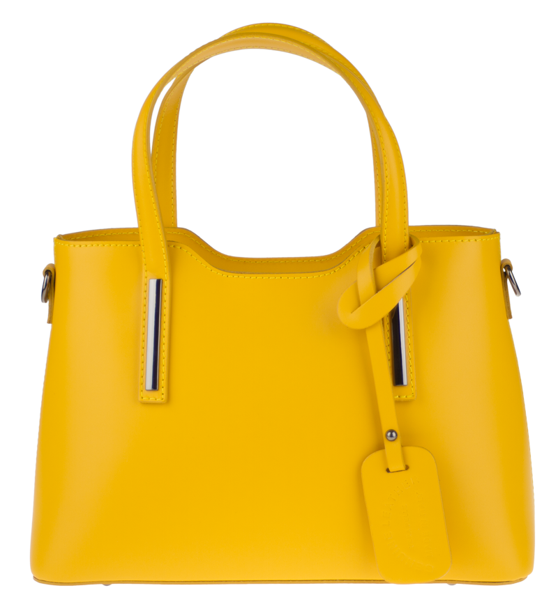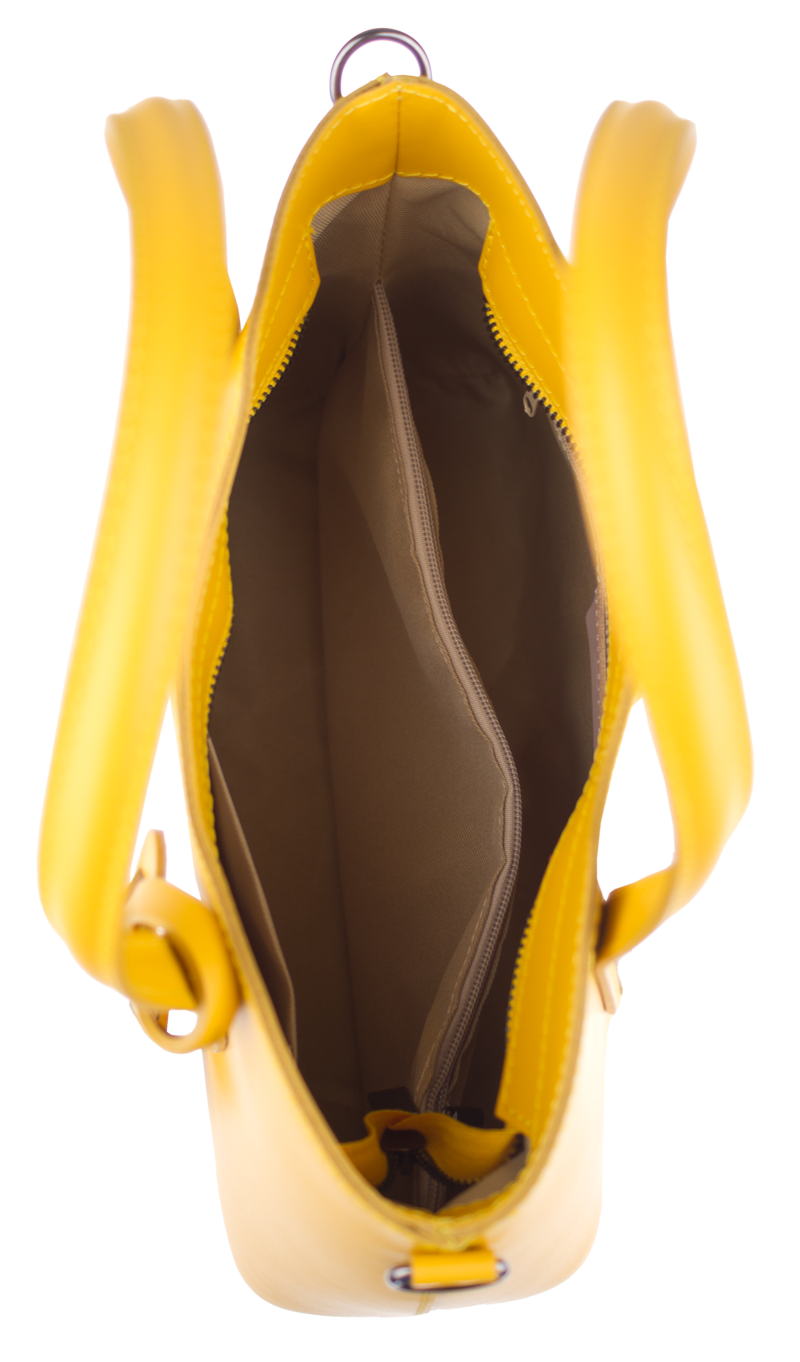 Praktická kabelka ve žlutém provedení pro každodenní nošení vyrobená z pevné pravé kůže. Nosí se v ruce nebo na rameni. Kabelka je uzavíratelná na zip. Součástí balení je přídavný popruh – cca 107 cm v plné délce. Uvnitř kabelky najdeme přepážku uprostřed, která zároveň slouží jako kapsa na zip, a na bočních stěnách pak kapsu na zip a 2 malé kapsy vhodné např. pro mobil a peněženku.