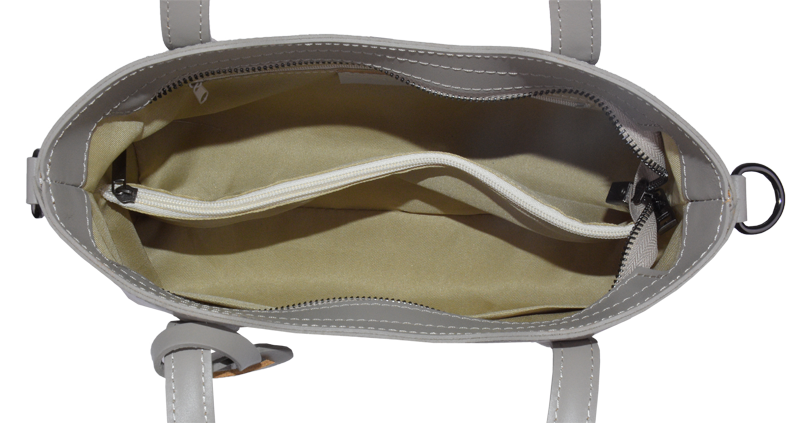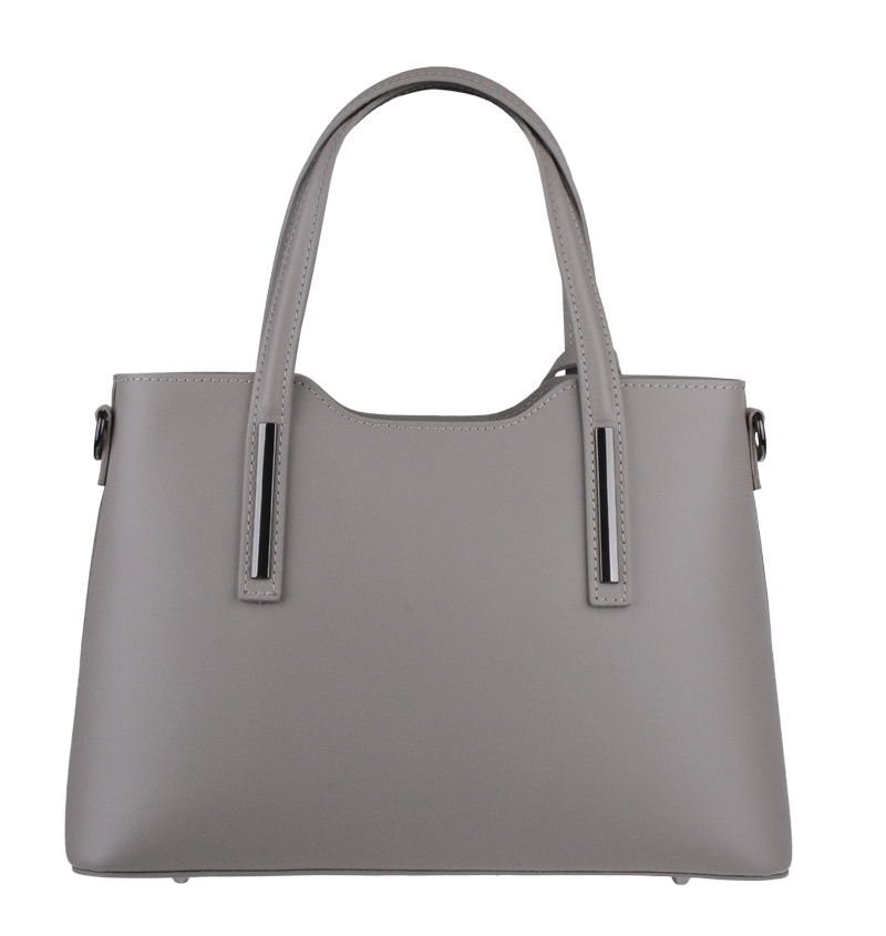 Praktická kabelka v šedém provedení pro každodenní nošení vyrobená z pevné pravé kůže. Nosí se v ruce nebo na rameni. Kabelka je uzavíratelná na zip. Součástí balení je přídavný popruh – cca 107 cm v plné délce. Uvnitř kabelky najdeme přepážku uprostřed, která zároveň slouží jako kapsa na zip, a na bočních stěnách pak kapsu na zip a 2 malé kapsy vhodné např. pro mobil a peněženku.