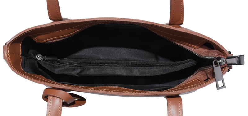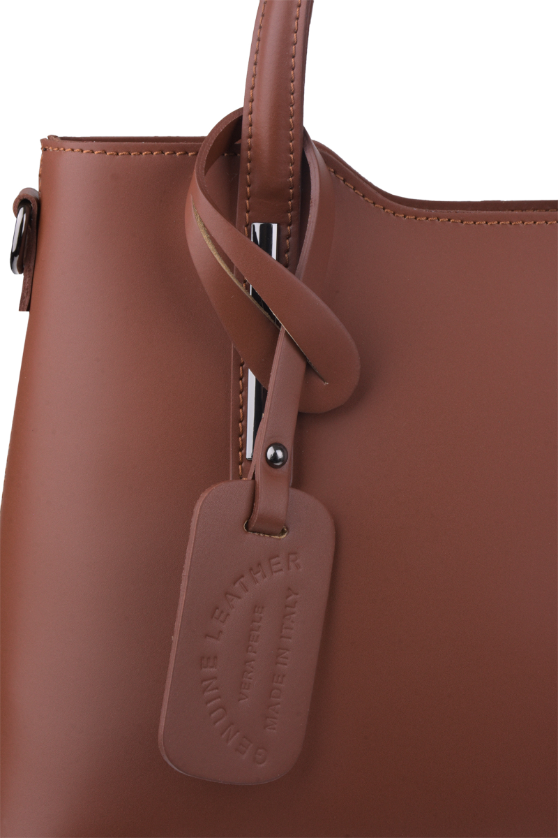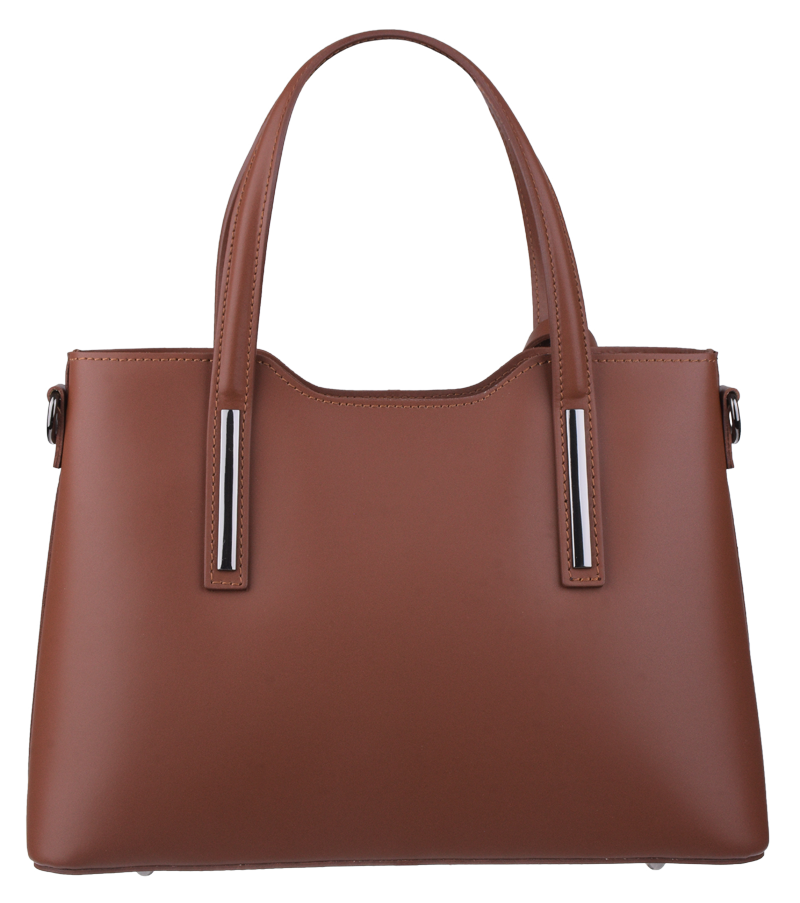 Praktická kabelka v hnědém provedení pro každodenní nošení vyrobená z pevné pravé kůže. Nosí se v ruce nebo na rameni. Kabelka je uzavíratelná na zip. Součástí balení je přídavný popruh – cca 107 cm v plné délce. Uvnitř kabelky najdeme přepážku uprostřed, která zároveň slouží jako kapsa na zip, a na bočních stěnách pak kapsu na zip a 2 malé kapsy vhodné např. pro mobil a peněženku.