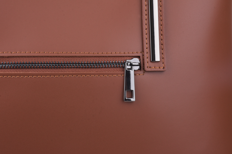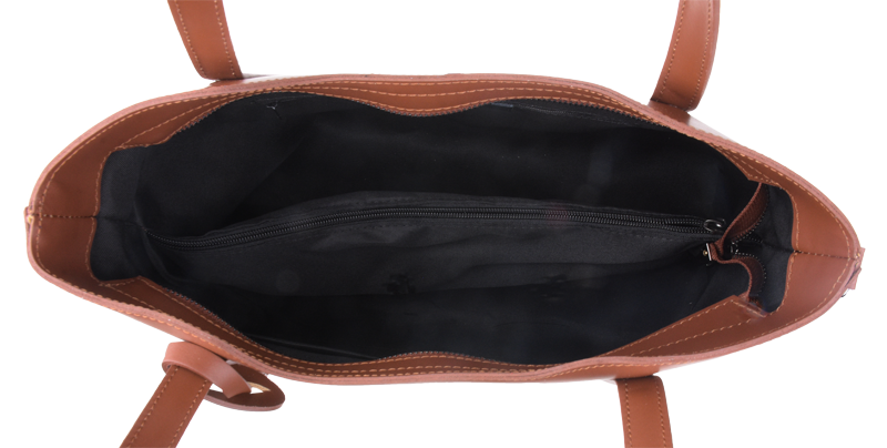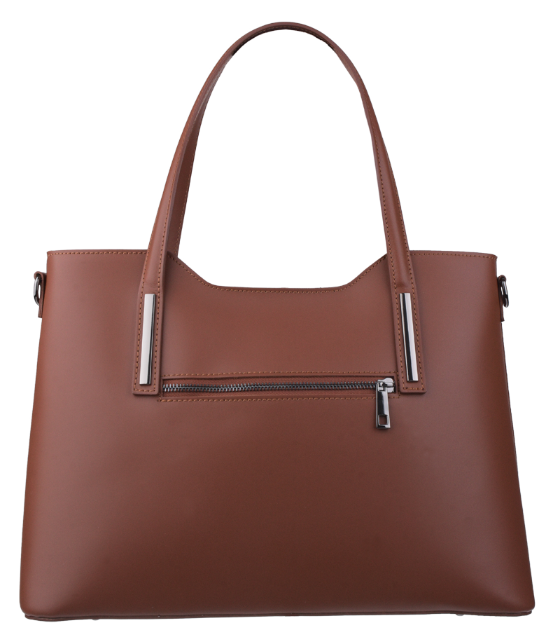 Praktická kabelka v hnědém provedení pro každodenní nošení vyrobená z pevné pravé kůže. Nosí se v ruce nebo na rameni. Kabelka je uzavíratelná na zip. Součástí balení je přídavný popruh – cca 107 cm v plné délce. Uvnitř kabelky najdeme přepážku uprostřed, která zároveň slouží jako kapsa na zip, a na bočních stěnách pak kapsu na zip a 2 malé kapsy vhodné např. pro mobil a peněženku.