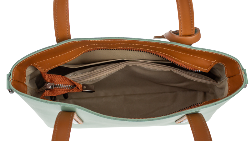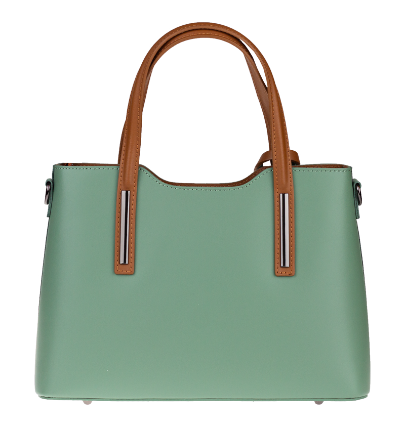 Praktická kabelka v mentolové provedení pro každodenní nošení vyrobená z pevné pravé kůže. Nosí se v ruce nebo na rameni. Kabelka je uzavíratelná na zip. Součástí balení je přídavný popruh – cca 107 cm v plné délce. Uvnitř kabelky najdeme přepážku uprostřed, která zároveň slouží jako kapsa na zip, a na bočních stěnách pak kapsu na zip a 2 malé kapsy vhodné např. pro mobil a peněženku.