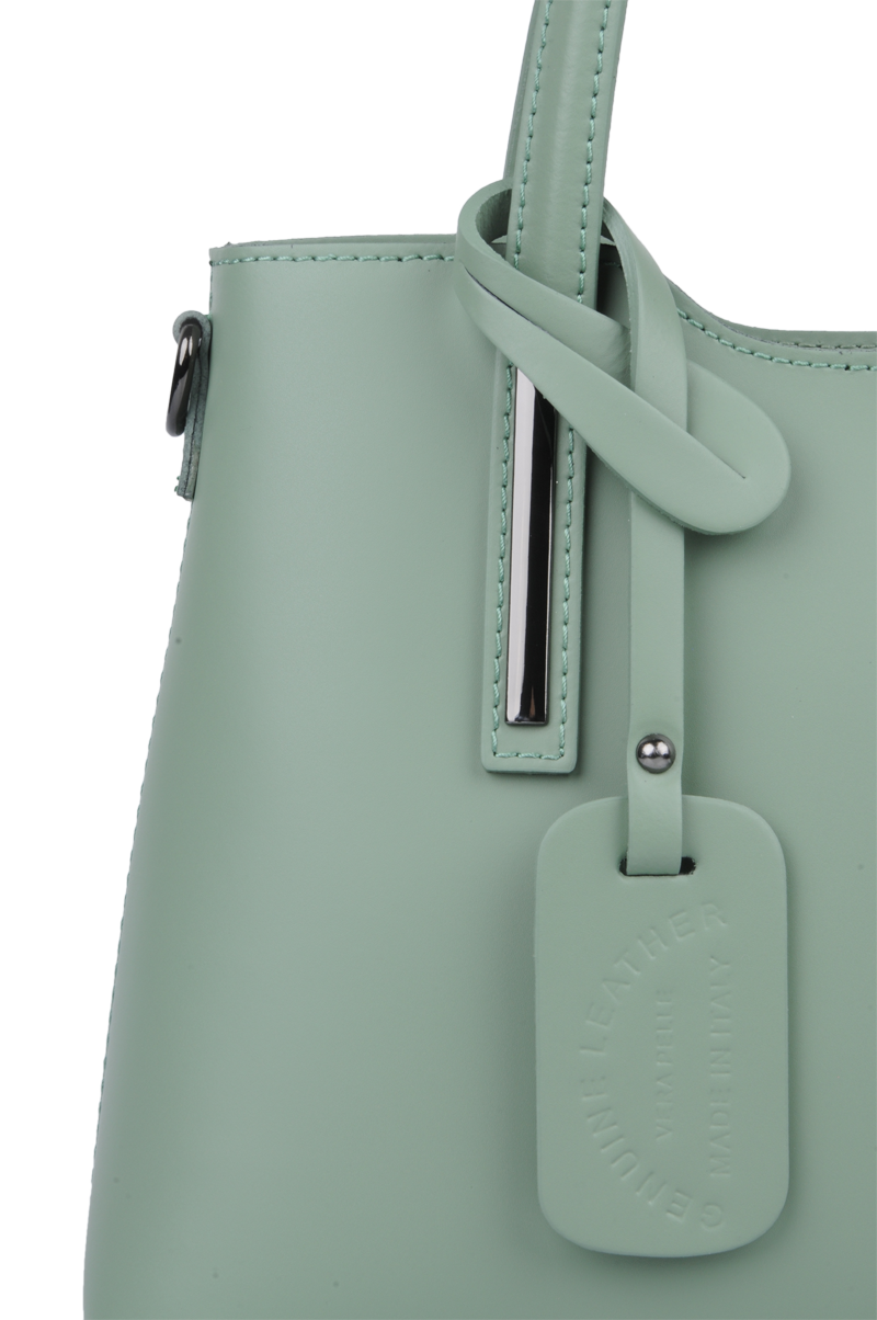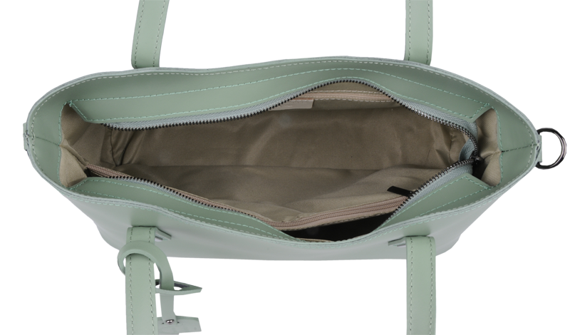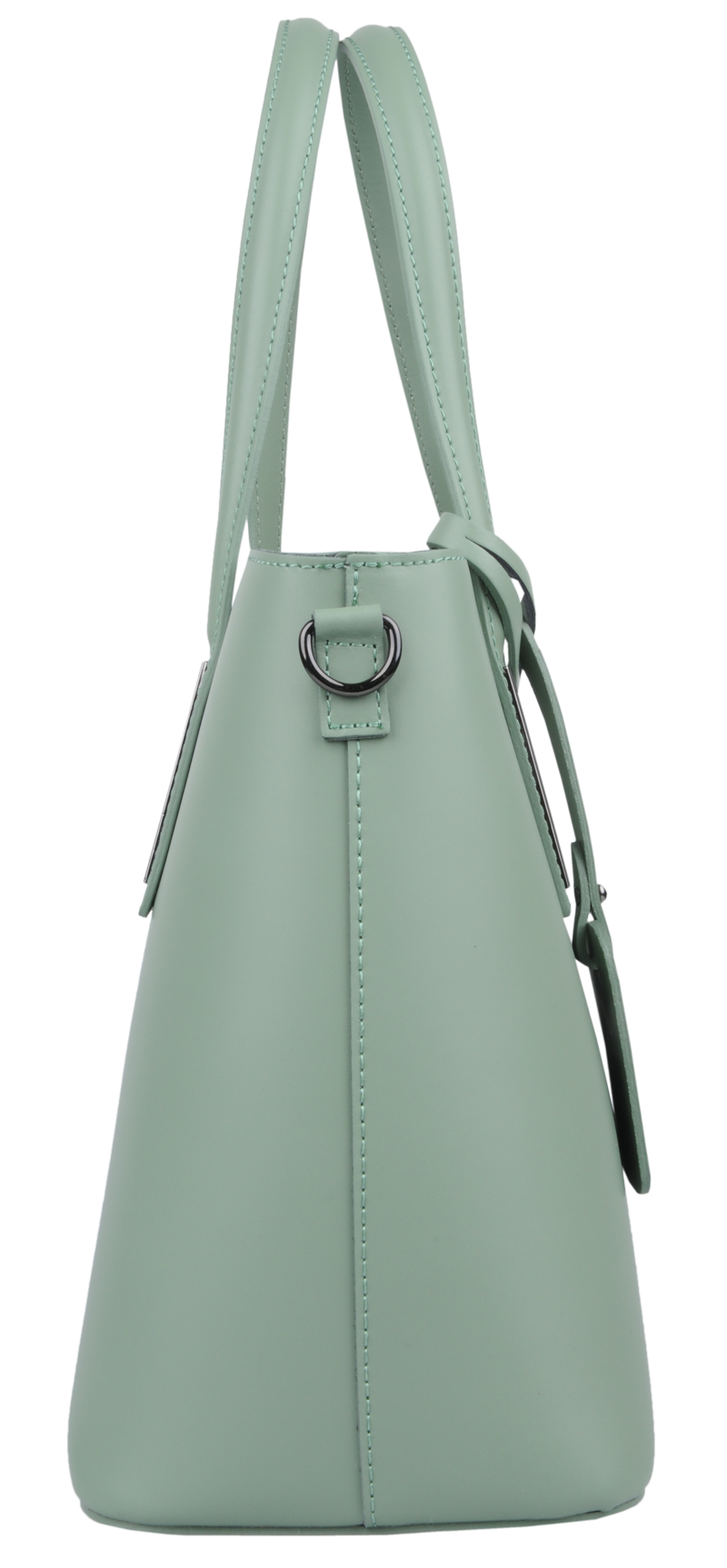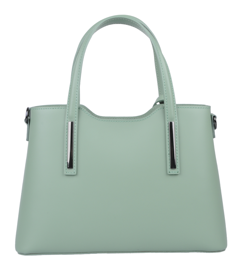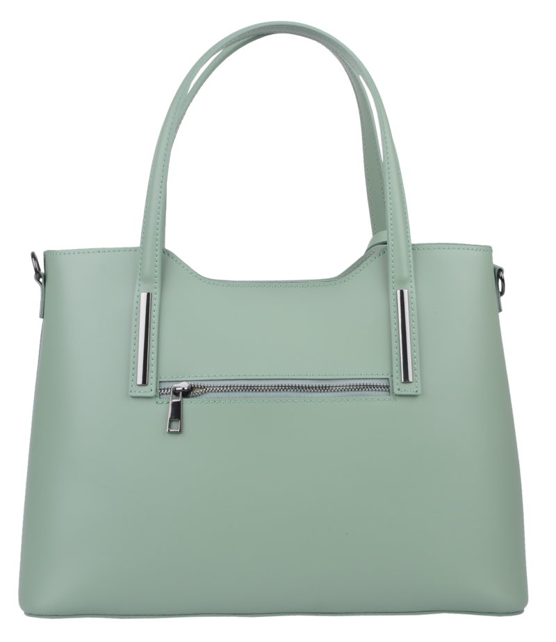 Praktická kabelka v mentolové provedení pro každodenní nošení vyrobená z pevné pravé kůže. Nosí se v ruce nebo na rameni. Kabelka je uzavíratelná na zip. Součástí balení je přídavný popruh – cca 107 cm v plné délce. Uvnitř kabelky najdeme přepážku uprostřed, která zároveň slouží jako kapsa na zip, a na bočních stěnách pak kapsu na zip a 2 malé kapsy vhodné např. pro mobil a peněženku.