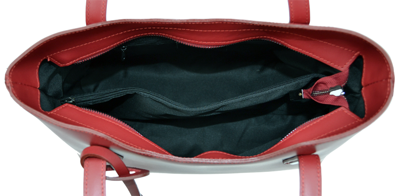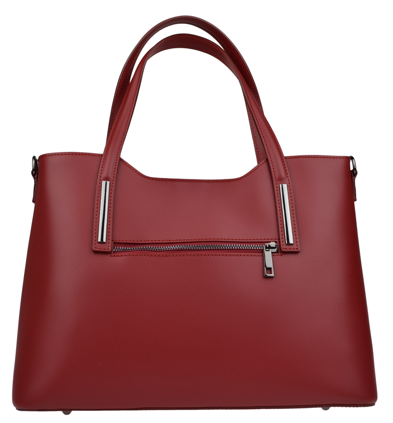 Praktická kabelka v červeném provedení pro každodenní nošení vyrobená z pevné pravé kůže. Nosí se v ruce nebo na rameni. Kabelka je uzavíratelná na zip. Součástí balení je popruh – cca 107 cm v plné délce. Uvnitř kabelky najdeme přepážku uprostřed, která zároveň slouží jako kapsa na zip, a na bočních stěnách pak kapsu na zip a 2 malé kapsy vhodné např. pro mobil a peněženku.