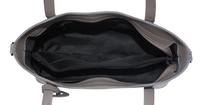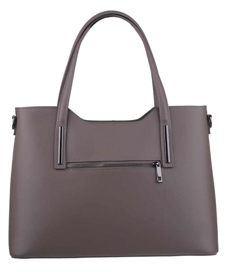 Praktická kabelka v šedo-hnědém provedení pro každodenní nošení vyrobená z pevné pravé kůže. Nosí se v ruce nebo na rameni. Kabelka je uzavíratelná na zip. Součástí balení je přídavný popruh – cca 107 cm v plné délce. Uvnitř kabelky najdeme přepážku uprostřed, která zároveň slouží jako kapsa na zip, a na bočních stěnách pak kapsu na zip a 2 malé kapsy vhodné např. pro mobil a peněženku.