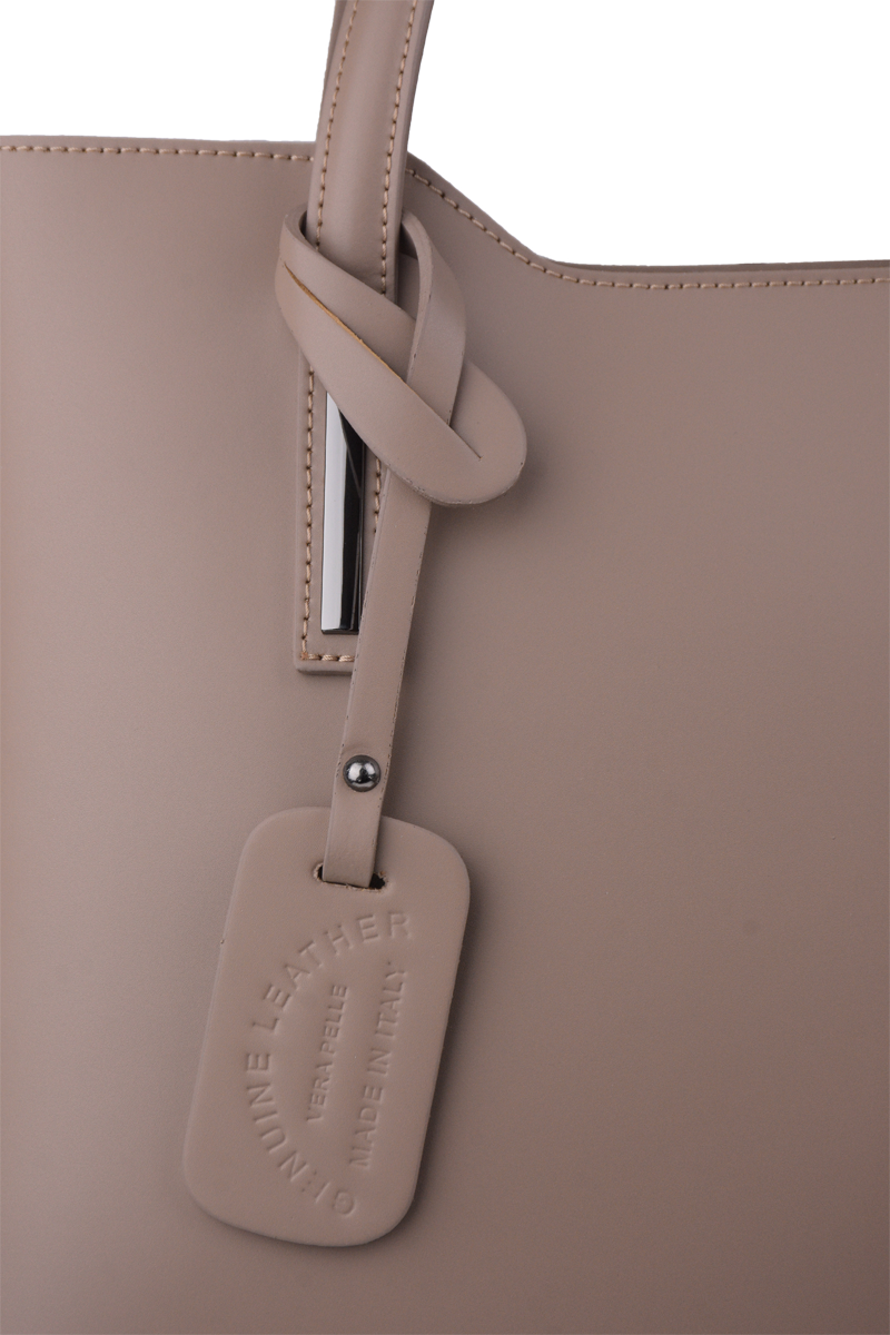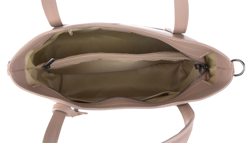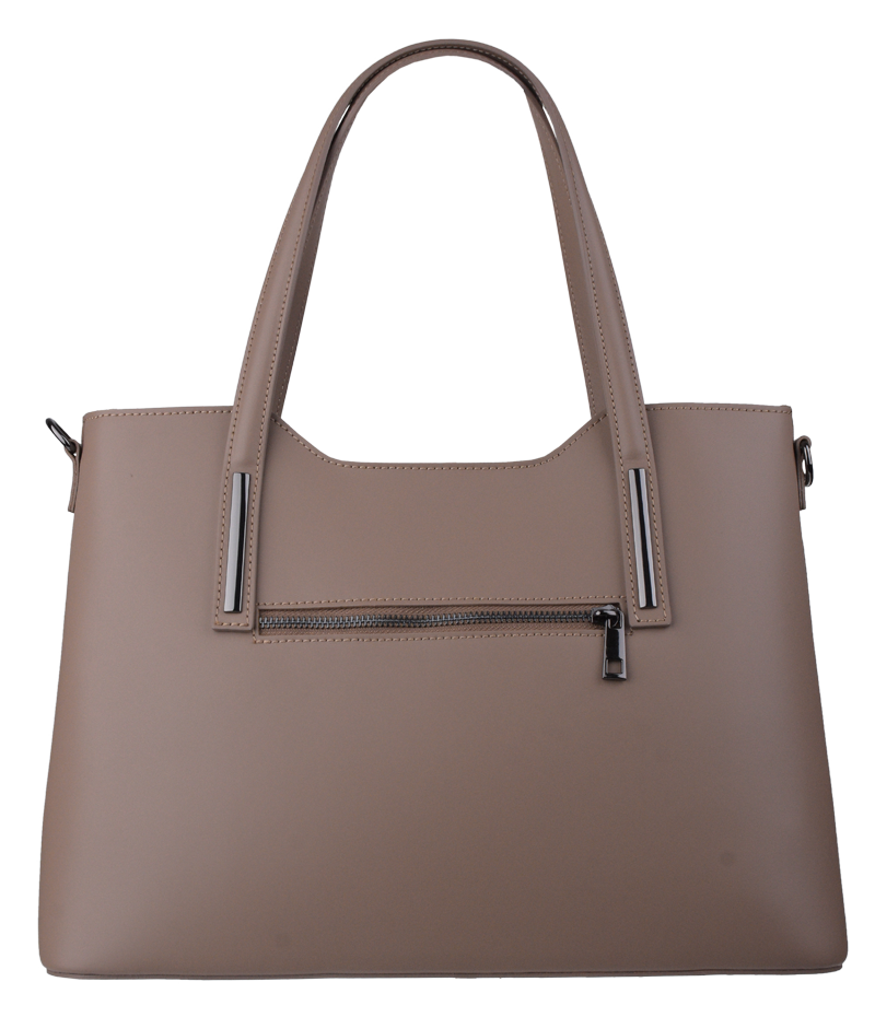 Praktická kabelka v šedo-hnědém provedení pro každodenní nošení vyrobená z pevné pravé kůže. Nosí se v ruce nebo na rameni. Kabelka je uzavíratelná na zip. Součástí balení je přídavný popruh – cca 107 cm v plné délce. Uvnitř kabelky najdeme přepážku uprostřed, která zároveň slouží jako kapsa na zip, a na bočních stěnách pak kapsu na zip a 2 malé kapsy vhodné např. pro mobil a peněženku.