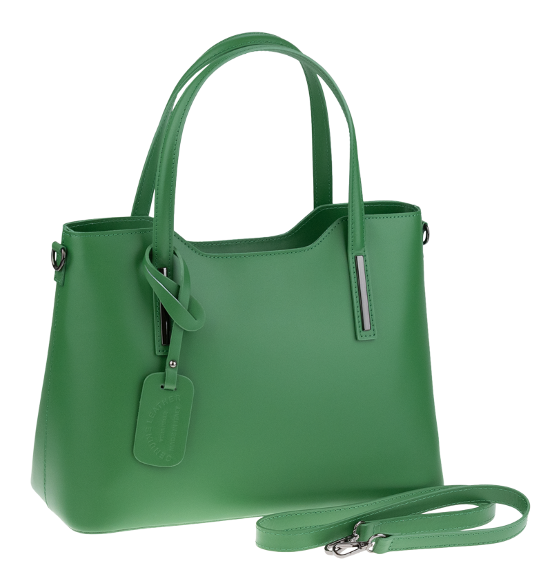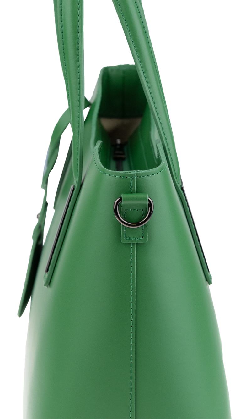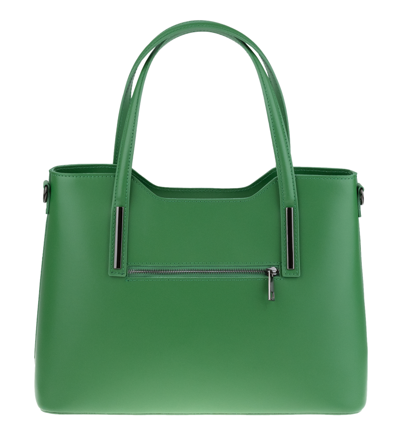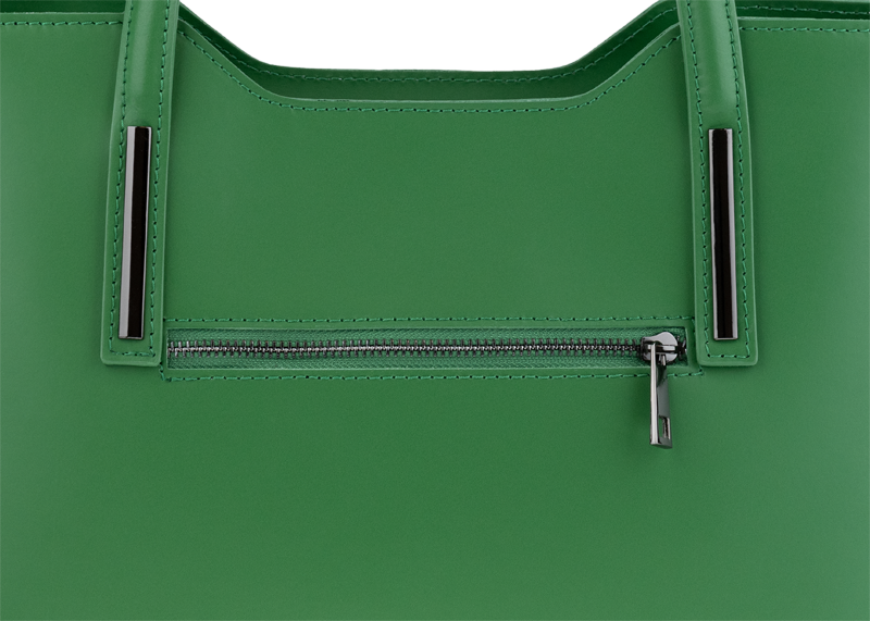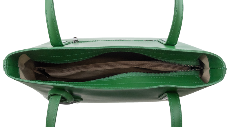 Praktická kabelka v zeleném provedení pro každodenní nošení vyrobená z pevné pravé kůže. Nosí se v ruce nebo na rameni. Kabelka je uzavíratelná na zip. Součástí balení je přídavný popruh – cca 107 cm v plné délce. Uvnitř kabelky najdeme přepážku uprostřed, která zároveň slouží jako kapsa na zip, a na bočních stěnách pak kapsu na zip a 2 malé kapsy vhodné např. pro mobil a peněženku.