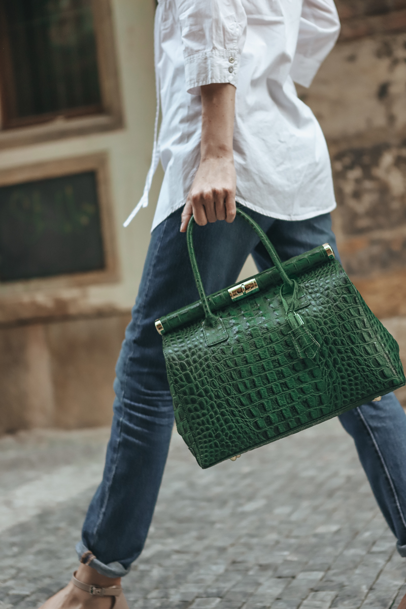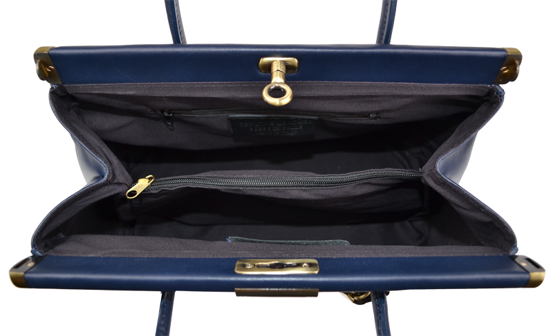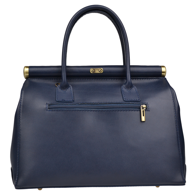 Kabelka zvaná též „doktorská“ se může pochlubit kromě svého klasického designu tím, že dobře drží tvar. Tmavě modrá kožená kabelka je nositelná do ruky a uzavíratelná na patentek, který pak v případě potřeby můžete uzamknout přiloženým zámečkem. Jejím materiálem je pravá hladká kůže. Uvnitř najdete kapsu na zip a 2 malé kapsy vhodné např. pro Váš mobil a peněženku a uprostřed je látková přepážka také s kapsou na zip. Kabelka má navíc k tomu všemu kapsu na zip na vnější zadní straně. Hloubka jejího dna je 15 cm. Další barevné varianty naleznete zde.