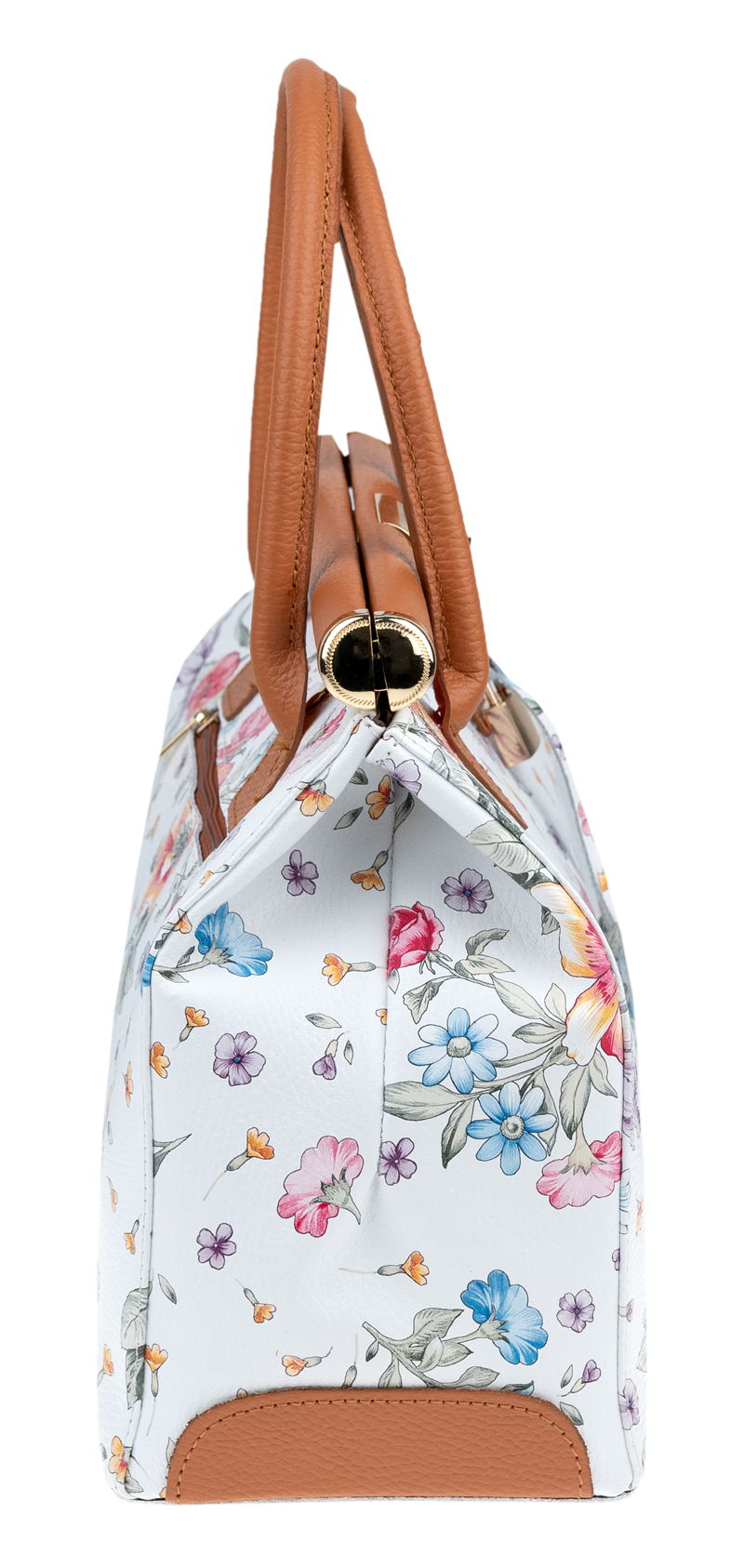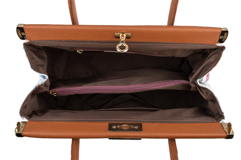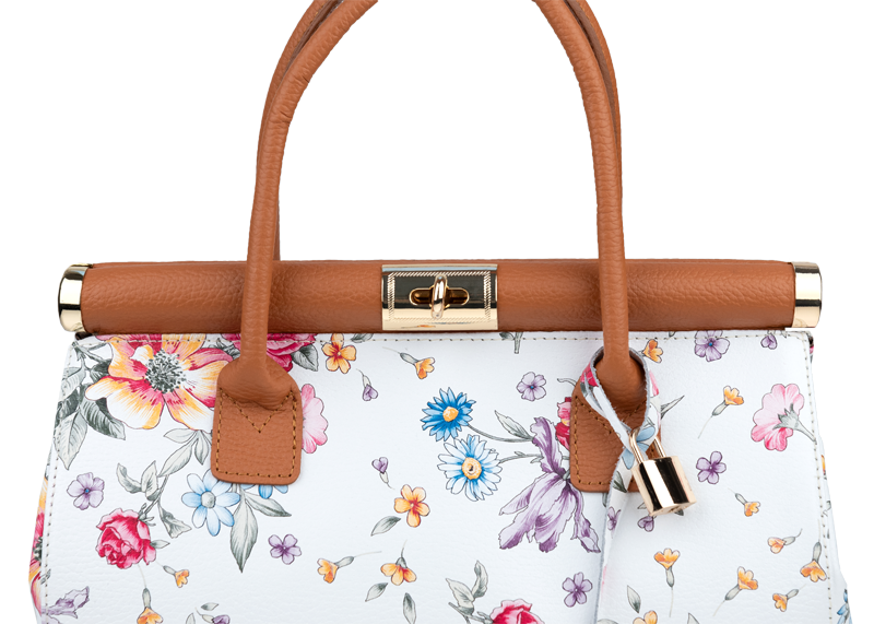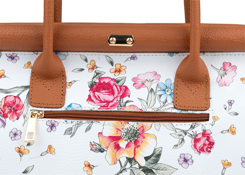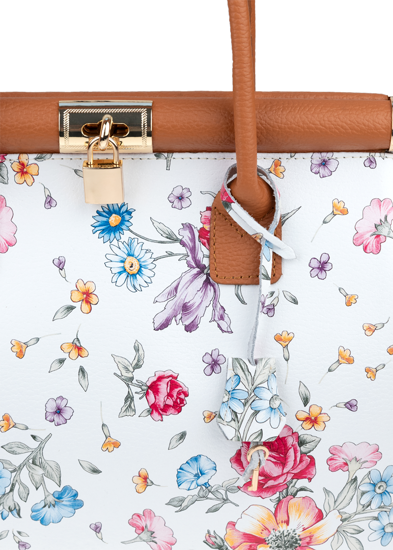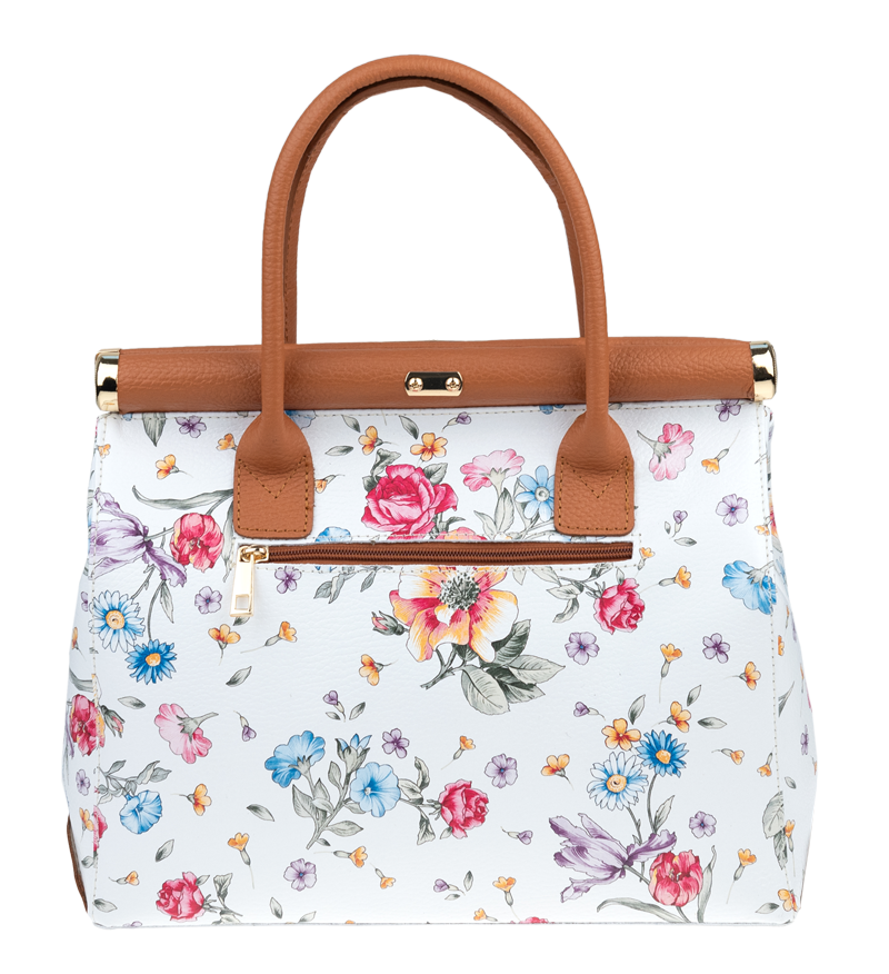 Tato kabelka zvaná též „doktorská“ se může pochlubit kromě svého klasického designu tím, že dobře drží tvar. Tato kožená kabelka je nositelná do ruky a uzavíratelná na patentek, který pak v případě potřeby můžete uzamknout přiloženým zámečkem. Jejím materiálem je pravá kůže v bílé barvě s jemným květinovým vzorem. Uvnitř najdete kapsu na zip a 2 malé kapsy vhodné např. pro Váš mobil a peněženku a uprostřed je látková přepážka také s kapsou na zip. Kabelka má navíc k tomu všemu kapsu na zip na vnější zadní straně. Hloubka jejího dna je 15 cm.