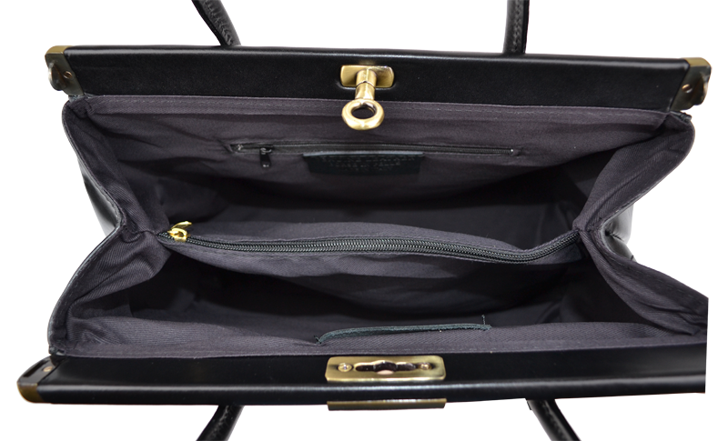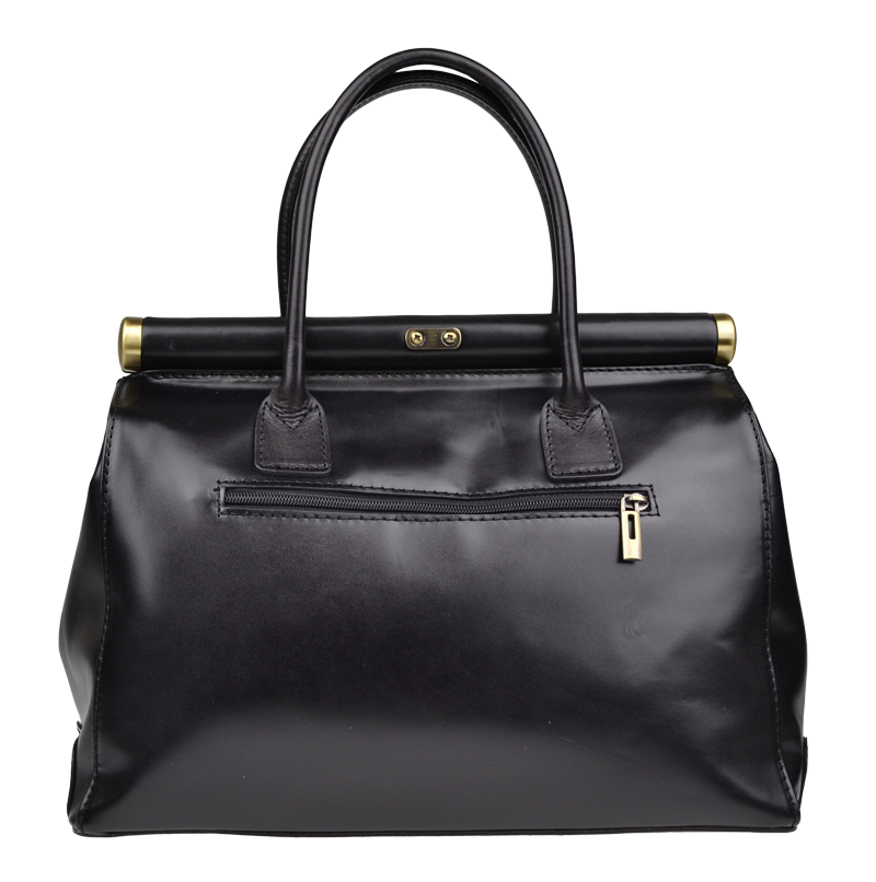 Tato kabelka zvaná též „doktorská“ se může pochlubit kromě svého klasického designu tím, že dobře drží tvar. Tato černá kožená kabelka je nositelná do ruky a uzavíratelná na patentek, který pak v případě potřeby můžete uzamknout přiloženým zámečkem. Jejím materiálem je pravá hladká kůže. Uvnitř najdete kapsu na zip a 2 malé kapsy vhodné např. pro Váš mobil a peněženku a uprostřed je látková přepážka také s kapsou na zip. Kabelka má navíc k tomu všemu kapsu na zip na vnější zadní straně. Hloubka jejího dna je 15 cm.
