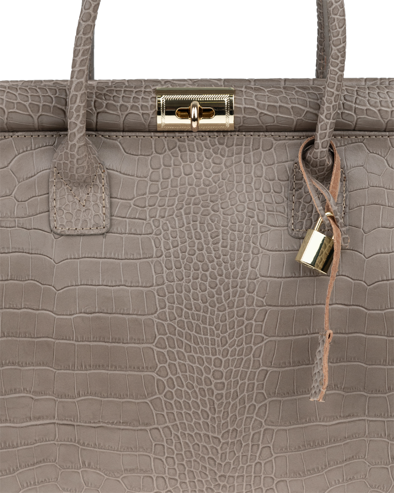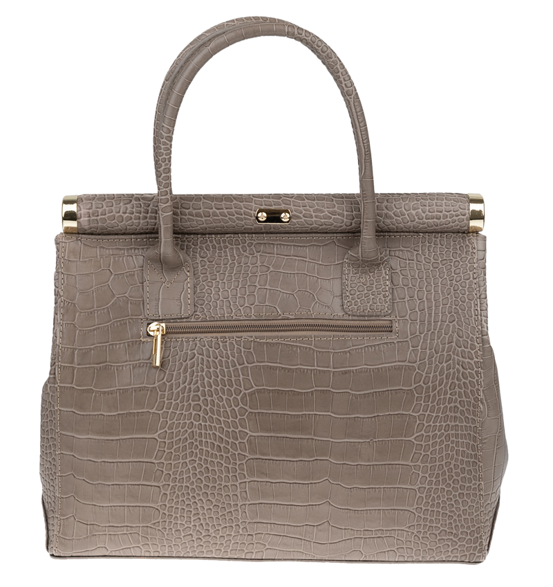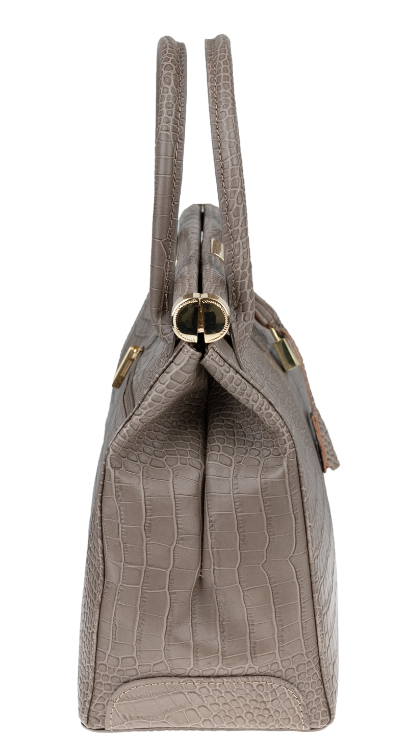 Tato kabelka zvaná též „doktorská“ se může pochlubit kromě svého klasického designu tím, že dobře drží tvar. Tato kožená kabelka je nositelná do ruky a uzavíratelná na patentek, který pak v případě potřeby můžete uzamknout přiloženým zámečkem. Jejím materiálem je pravá kůže s úpravou lesklé krokodýlí textury. Uvnitř najdete kapsu na zip a 2 malé kapsy vhodné např. pro Váš mobil a peněženku a uprostřed je látková přepážka také s kapsou na zip. Kabelka má navíc k tomu všemu kapsu na zip na vnější zadní straně. Hloubka jejího dna je 15 cm.