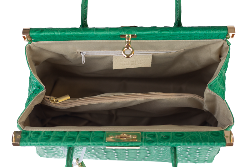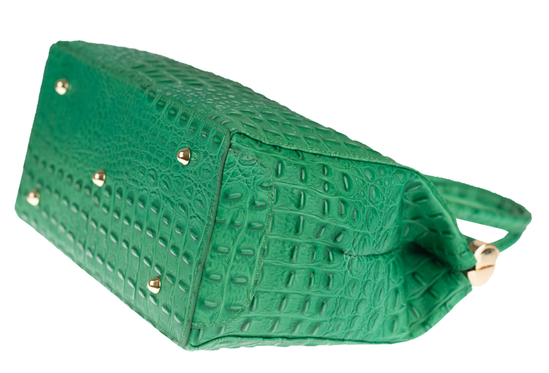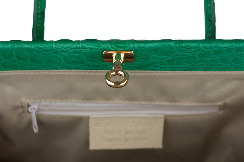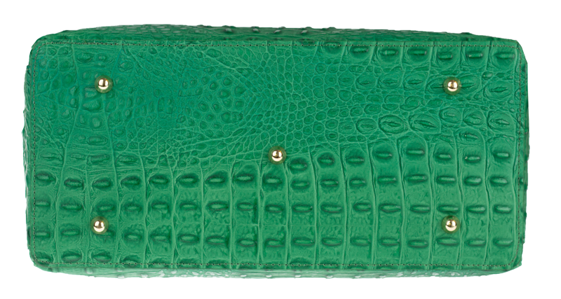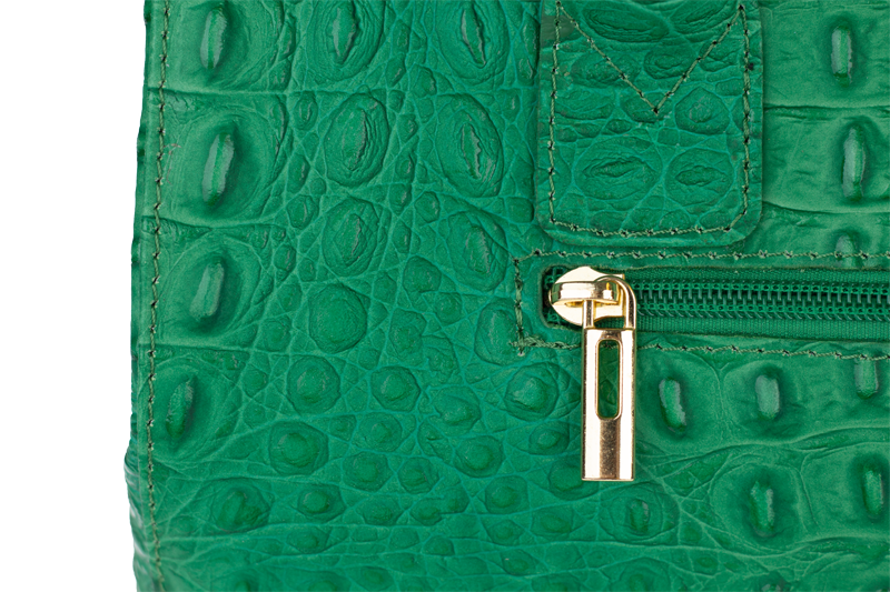Tato zelená kabelka zvaná též „doktorská“ se může pochlubit kromě svého klasického designu tím, že dobře drží tvar. Zelená kožená kabelka je nositelná do ruky a uzavíratelná na patentek, který pak v případě potřeby můžete uzamknout přiloženým zámečkem. Jejím materiálem je pravá kůže v zelené barvě. Uvnitř najdete kapsu na zip a 2 malé kapsy vhodné např. pro Váš mobil a peněženku a uprostřed je látková přepážka také s kapsou na zip. Kabelka má navíc k tomu všemu kapsu na zip na vnější zadní straně. Hloubka jejího dna je 15 cm.