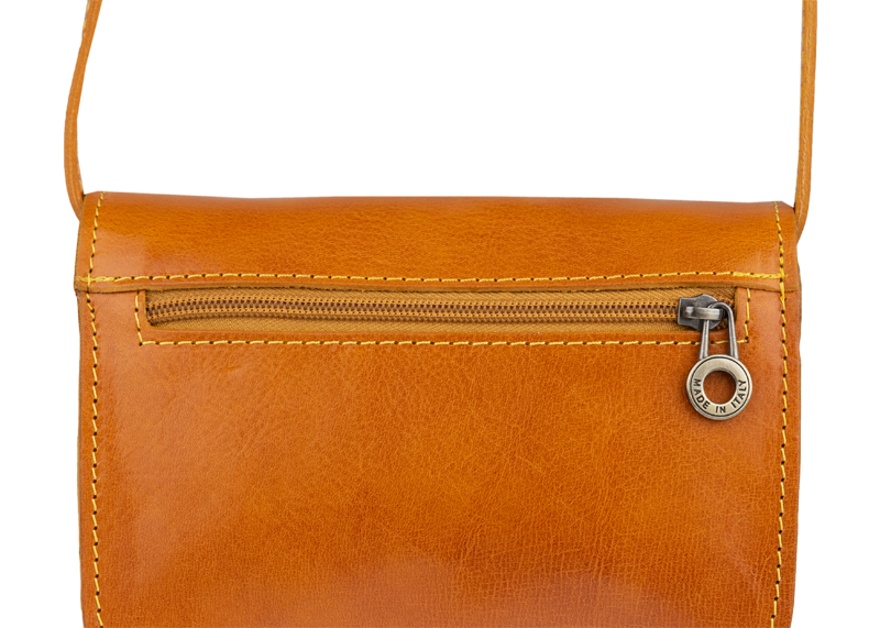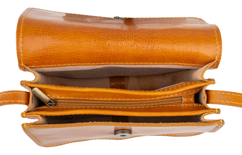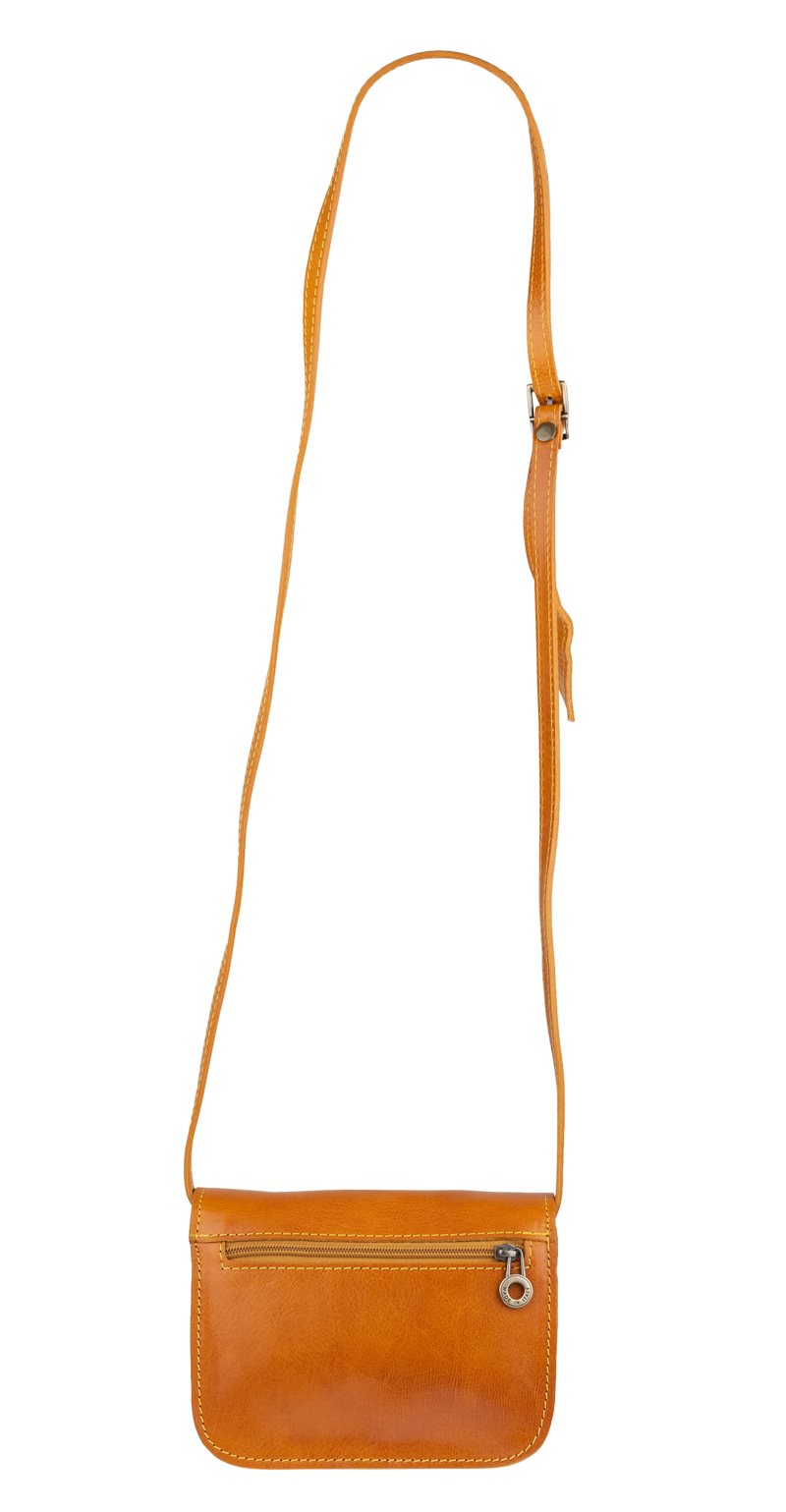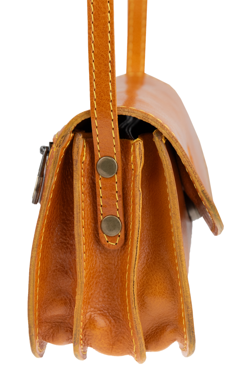 Malá šikovná kabelka se zajímavým tvarem. Kabelka je vyrobená z pravé kůže, která velice dobře drží svůj tvar. Je vhodná na nošení přes rameno nebo cross-body (křížem).