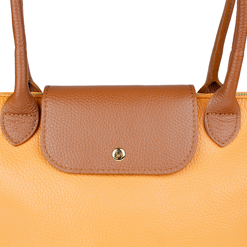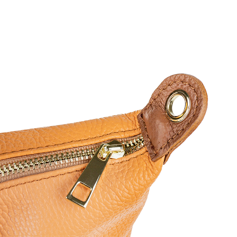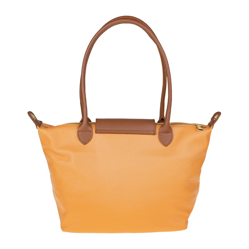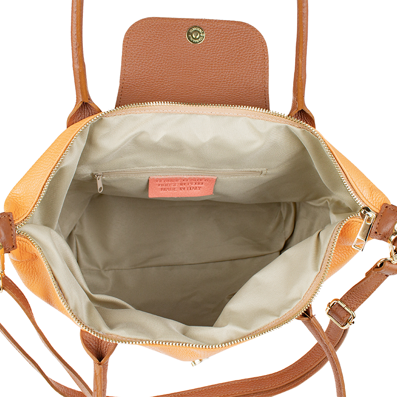 Praktická a prostorná kožená kabelka v meruňkové barvě. Jednoduché provedení a velký prostor dělá tuto kabelku neobyčejně praktickou pro denní nošení. Vnitřek kabelky je vybaven kapsou na zip. Přídavný popruh 120 cm.