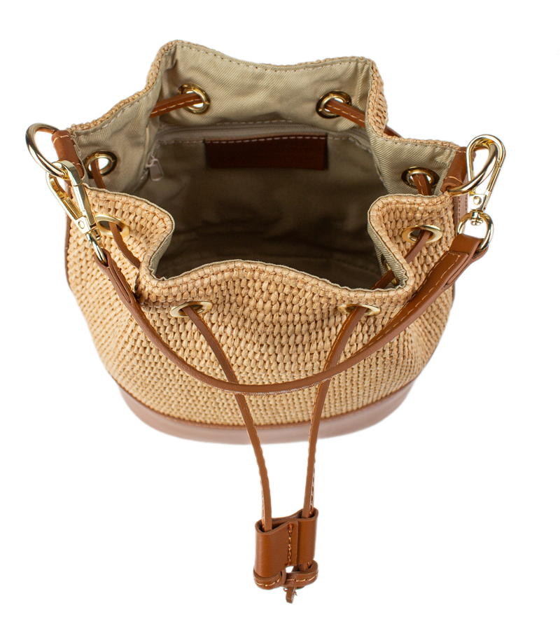 Stylový kontrast: Spojení světlého pleteného těla kabelky s hnědými detaily (dno, popruhy, lemování) působí svěže a velmi moderně.