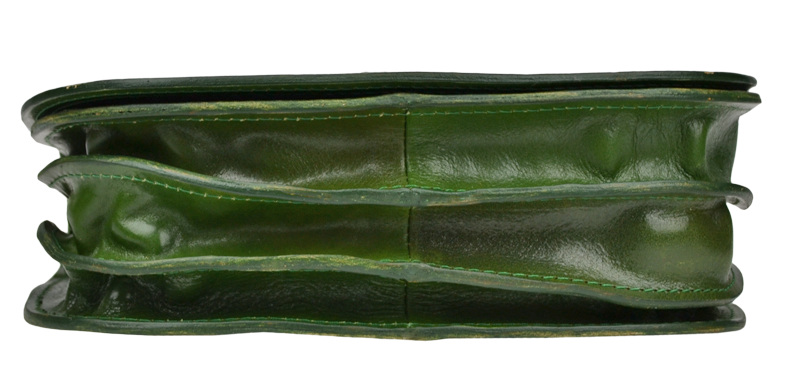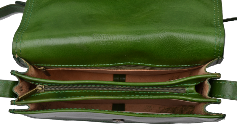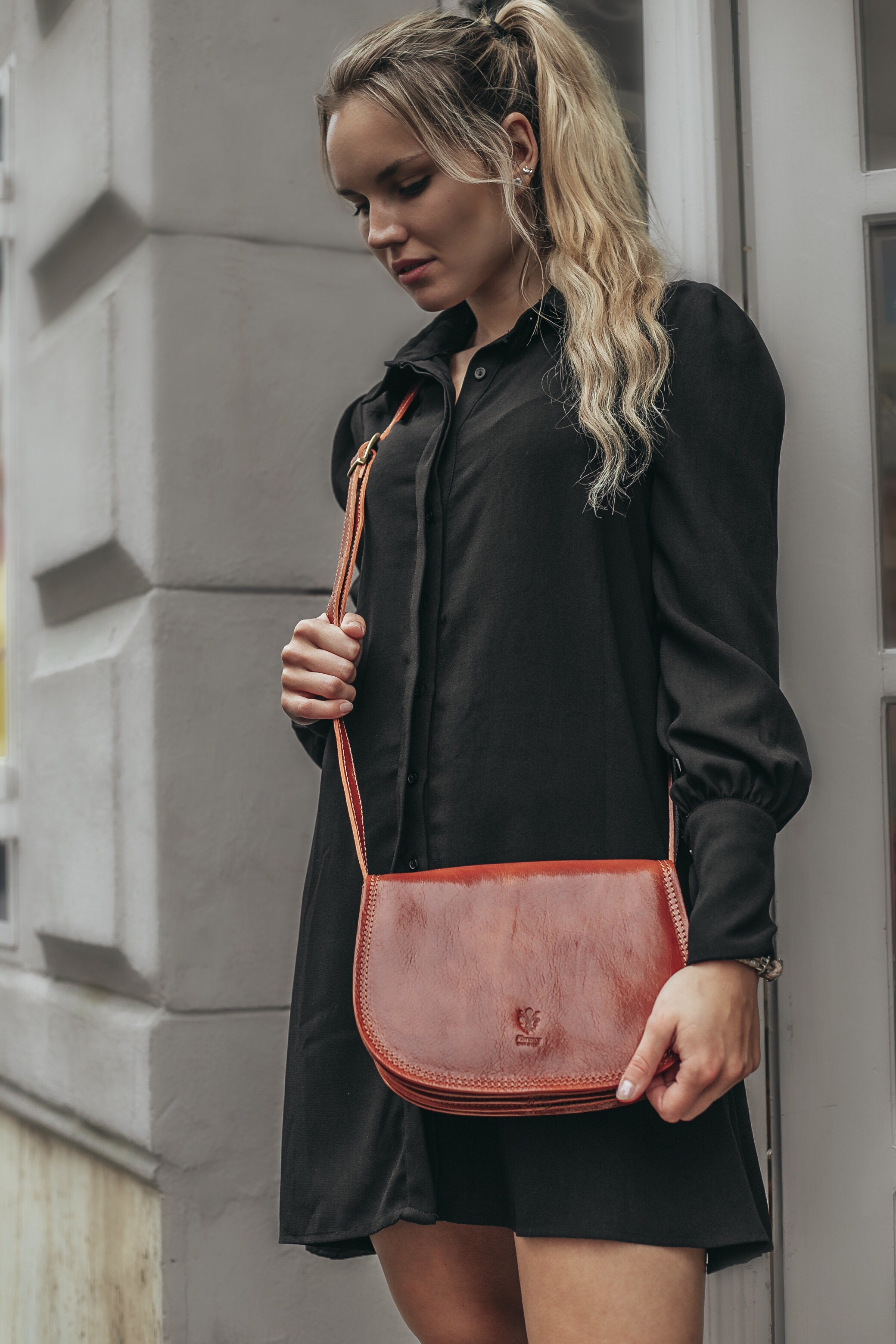 Malá šikovná kabelka se zajímavým tvarem. Kabelka je vyrobená z pravé kůže, která velice dobře drží svůj tvar. Je vhodná na nošení přes rameno nebo cross-body (křížem).