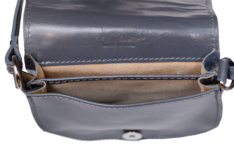 Malá šikovná kabelka se zajímavým tvarem. Kabelka je vyrobená z pravé kůže, která velice dobře drží svůj tvar. Je vhodná na nošení přes rameno nebo cross-body (křížem).
