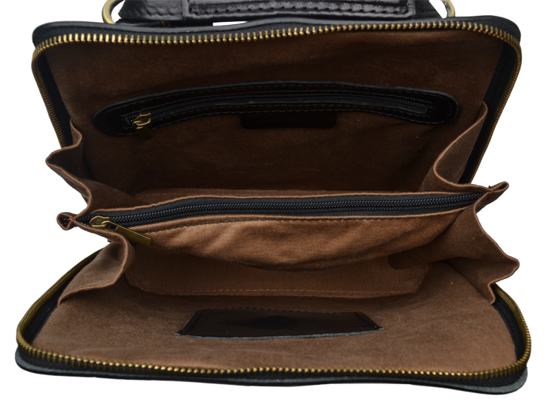Černý kožený batůžek, se zlatými kovovými doplňky a zipy.