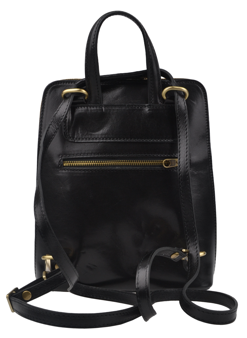 Černý kožený batůžek, se zlatými kovovými doplňky a zipy. Další barevné varianty batůžku Mirta naleznete zde.