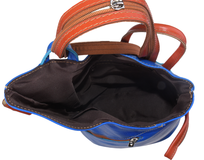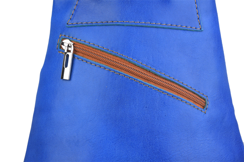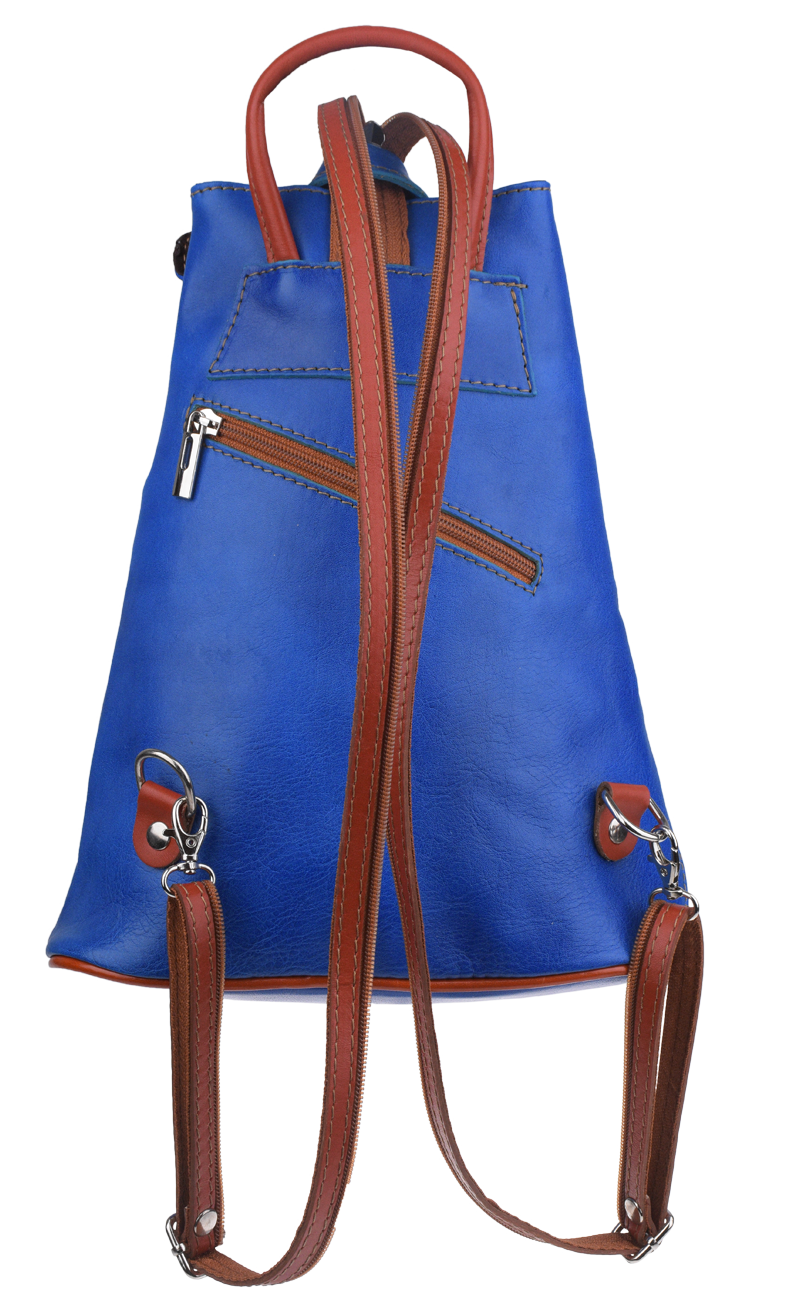 Jedinečný kožený batůžek se zajímavým tvarem. Dominantním prvkem kabelky je její zapínání na kožený knoflík. Zvenku u uvnitř kabelky můžete využít malé zapínací kapsy na zip pro Váš mobil či klíče. Velmi zajímavé je provedení popruhů batůžku, popruhy lze upravit zipem a tím si můžete určit způsob nošení batůžku.