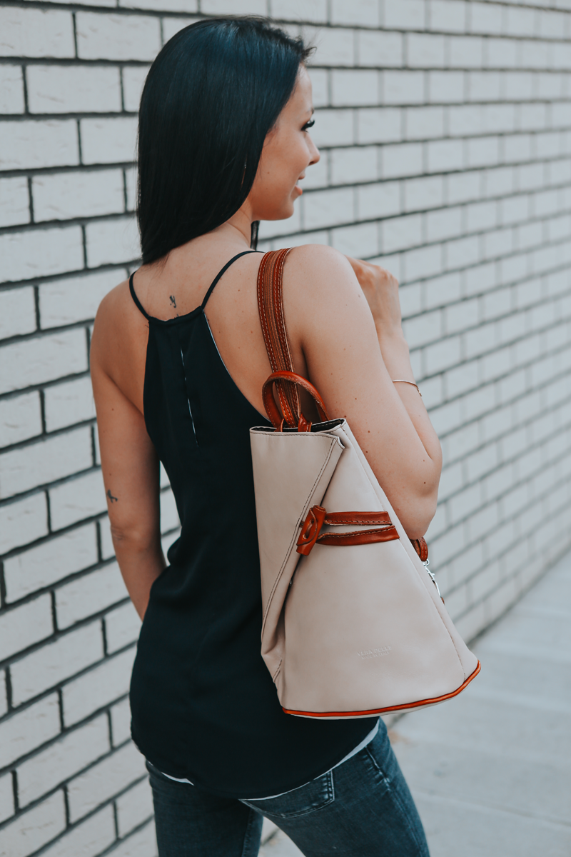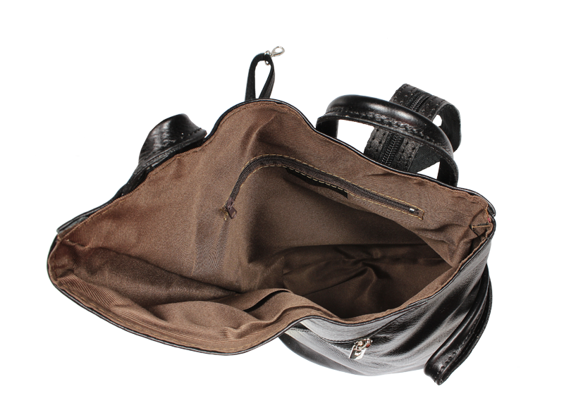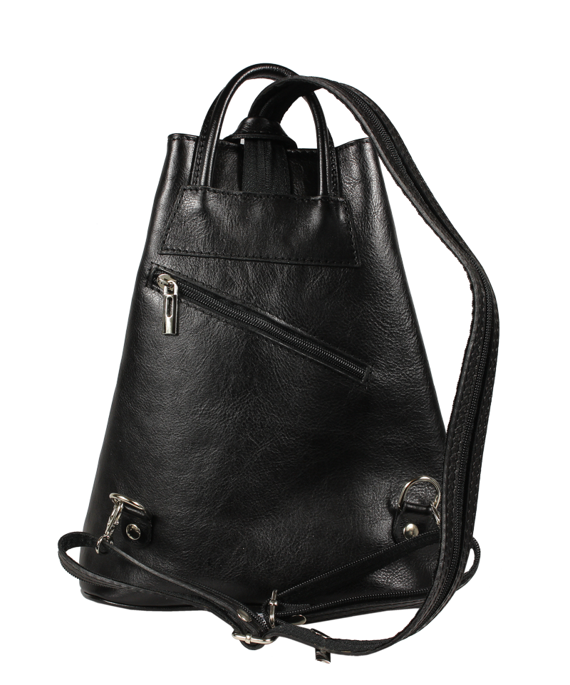 Jedinečný kožený batůžek se zajímavým tvarem. Dominantním prvkem kabelky je její zapínání na kožený knoflík. Zvenku u uvnitř kabelky můžete využít malé zapínací kapsy na zip pro Váš mobil či klíče. Velmi zajímavé je provedení popruhů batůžku, popruhy lze upravit zipem a tím si můžete určit způsob nošení batůžku.