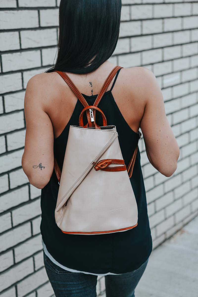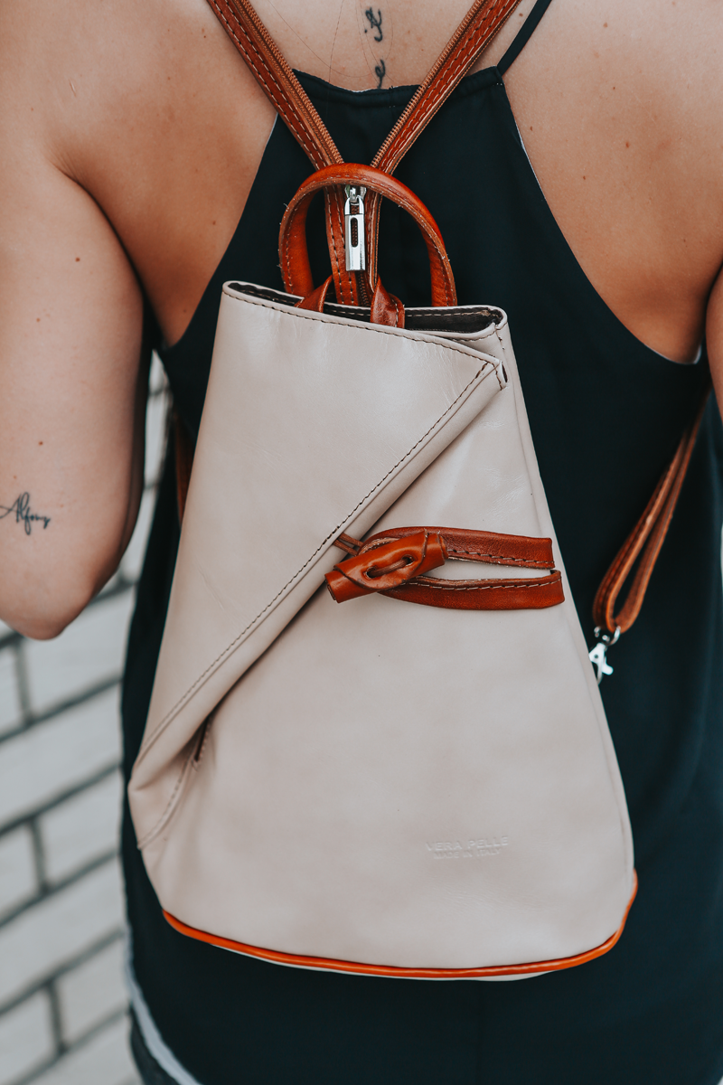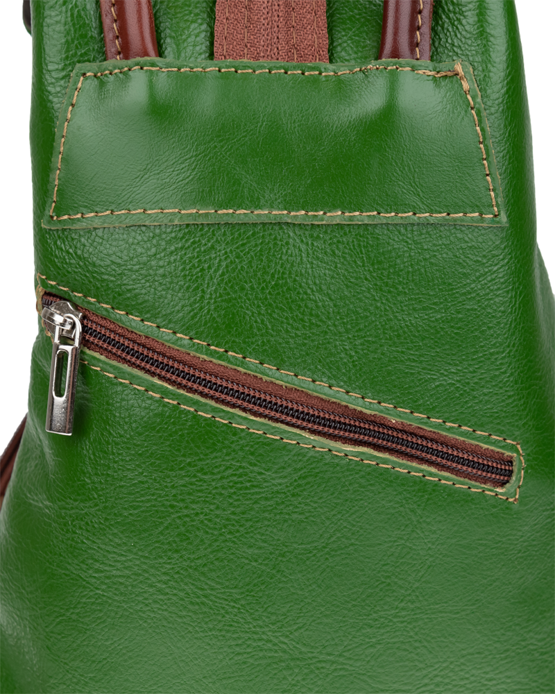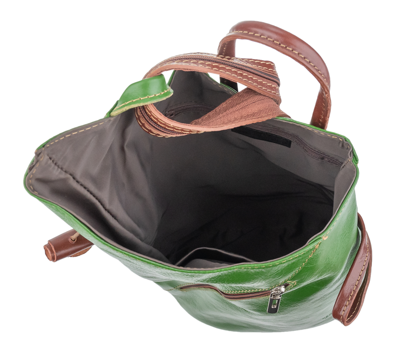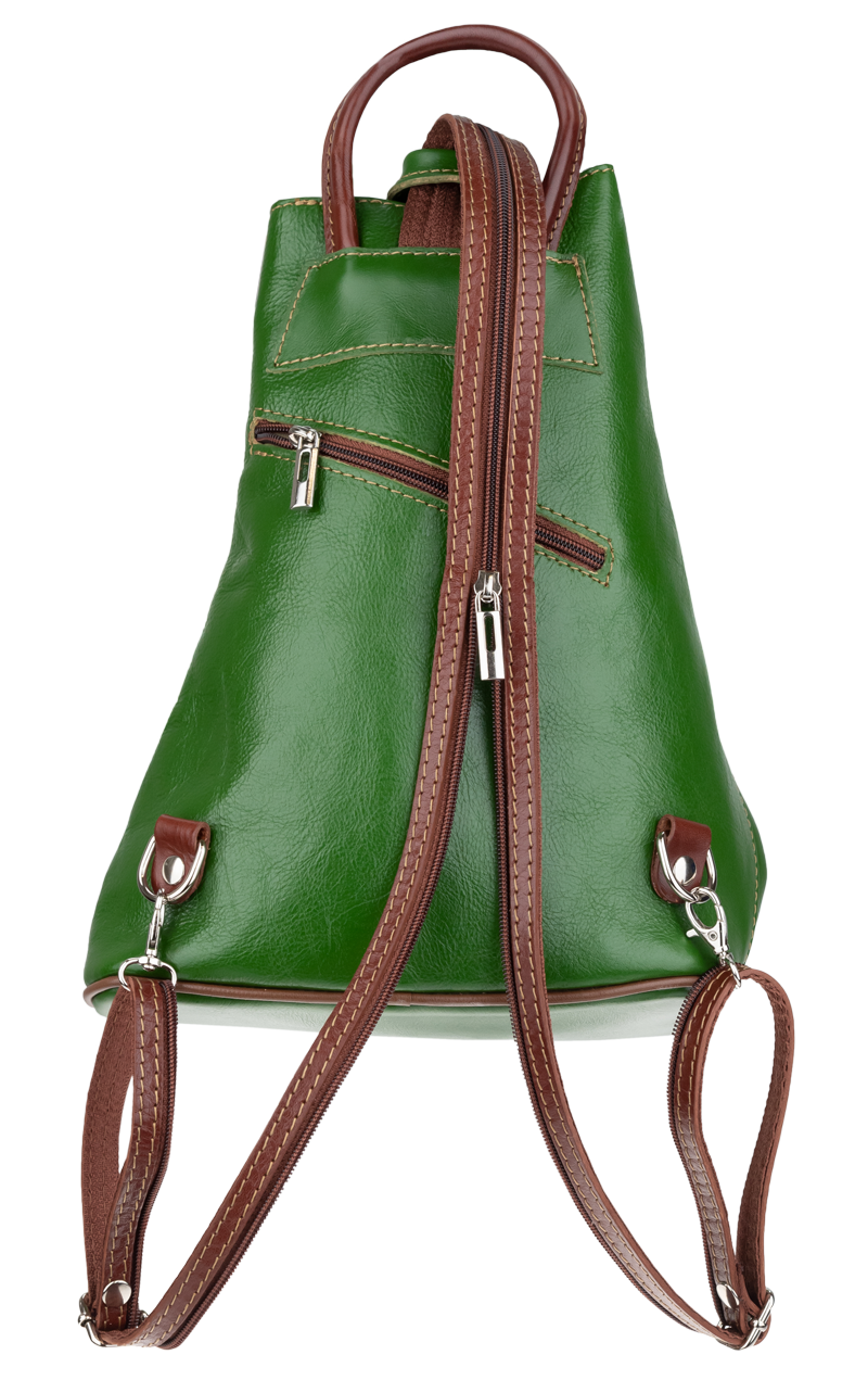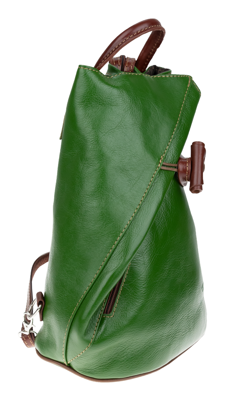 Jedinečný kožený batůžek se zajímavým tvarem. Dominantním prvkem kabelky je její zapínání na kožený knoflík. Zvenku u uvnitř kabelky můžete využít malé zapínací kapsy na zip pro Váš mobil či klíče. Velmi zajímavé je provedení popruhů batůžku, popruhy lze upravit zipem a tím si můžete určit způsob nošení batůžku.