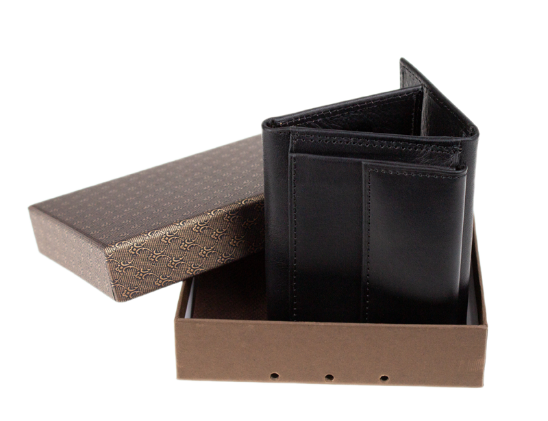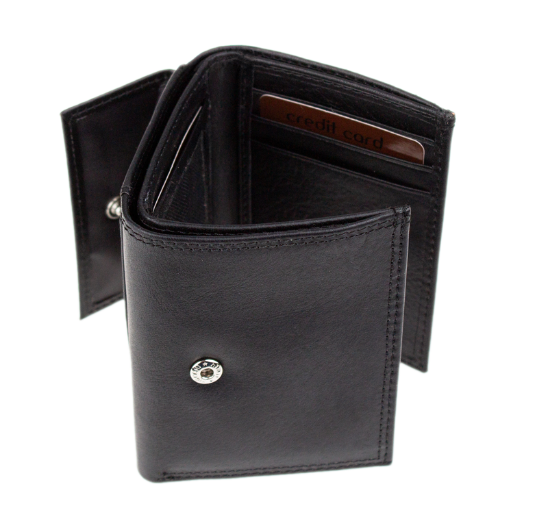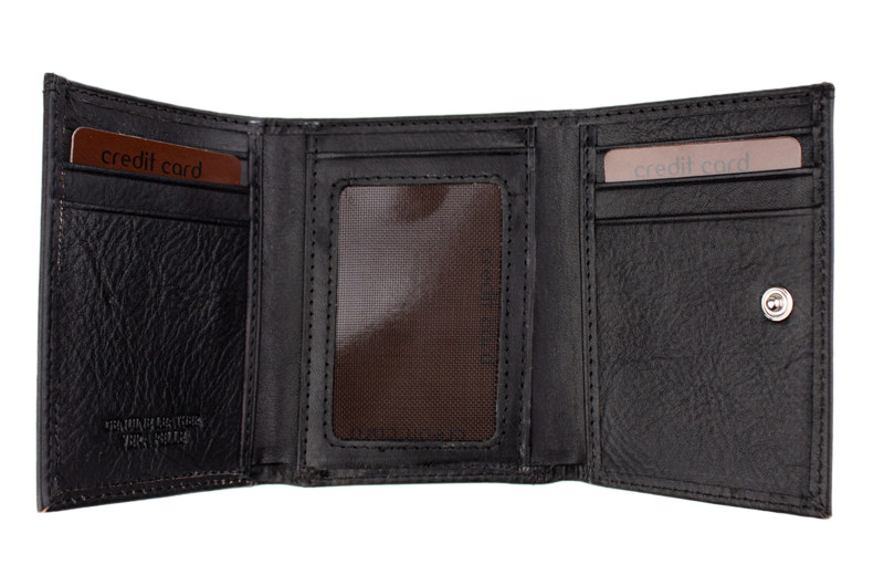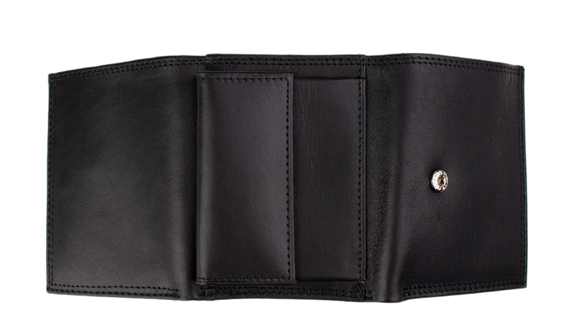 Tato černá kožená peněženka v sobě spojuje klasickou eleganci s netradičním, ale vysoce funkčním uspořádáním. Hlavní dominantou je „tri-fold“ (trojité) skládání, které maximalizuje vnitřní prostor při zachování malých vnějších rozměrů.
