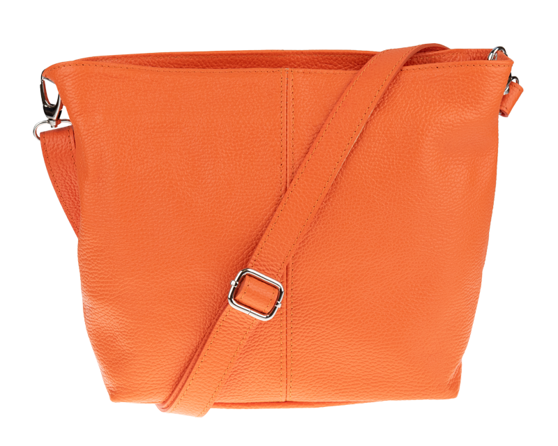 Oranžová kabelka nositelná přes rameno či cross-body (křížem). Tato kožená kabelka je uzavíratelná na zip. Uvnitř kabelky najdeme přepážku uprostřed, která zároveň slouží jako kapsa na zip, a na boční stěně pak kapsu na zip. Hloubka jejího dna je 13 cm.