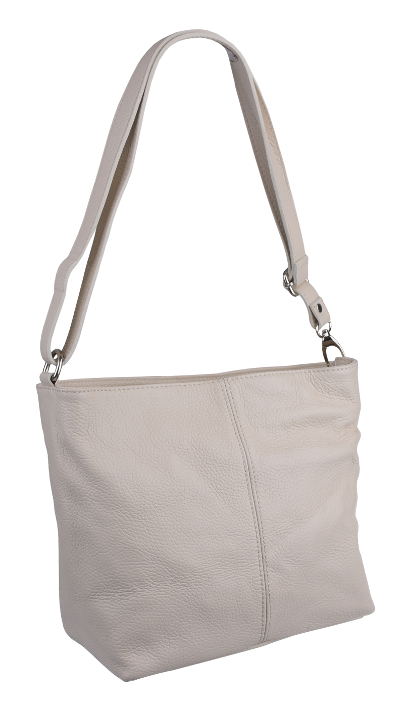 Béžová kabelka nositelná přes rameno či cross-body (křížem). Tato kožená kabelka je uzavíratelná na zip. Uvnitř kabelky najdeme přepážku uprostřed, která zároveň slouží jako kapsa na zip, a na boční stěně pak kapsu na zip. Hloubka jejího dna je 13 cm.