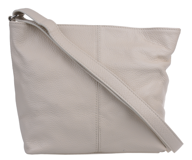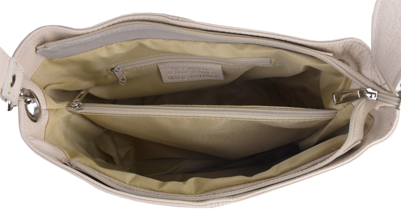 Béžová kabelka nositelná přes rameno či cross-body (křížem). Tato kožená kabelka je uzavíratelná na zip. Uvnitř kabelky najdeme přepážku uprostřed, která zároveň slouží jako kapsa na zip, a na boční stěně pak kapsu na zip. Hloubka jejího dna je 13 cm. Kabelka má navíc nastavitelný popruh s maximální délkou cca 120 cm.