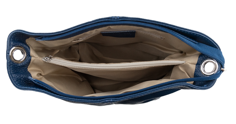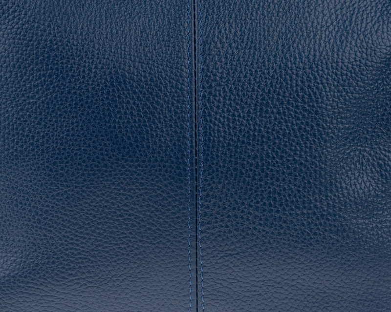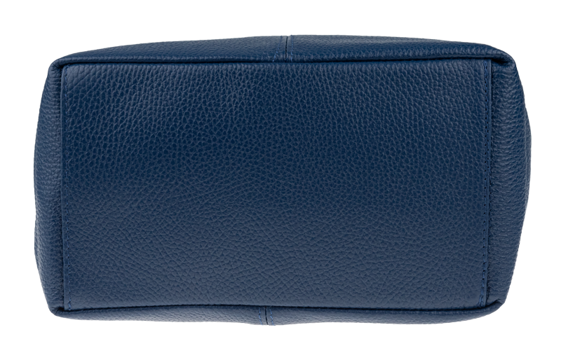 Modrá kabelka nositelná přes rameno či cross-body (křížem). Tato kožená kabelka je uzavíratelná na zip. Uvnitř kabelky najdeme přepážku uprostřed, která zároveň slouží jako kapsa na zip, a na boční stěně pak kapsu na zip. Hloubka jejího dna je 13 cm. Kabelka má navíc nastavitelný popruh s maximální délkou cca 120 cm.