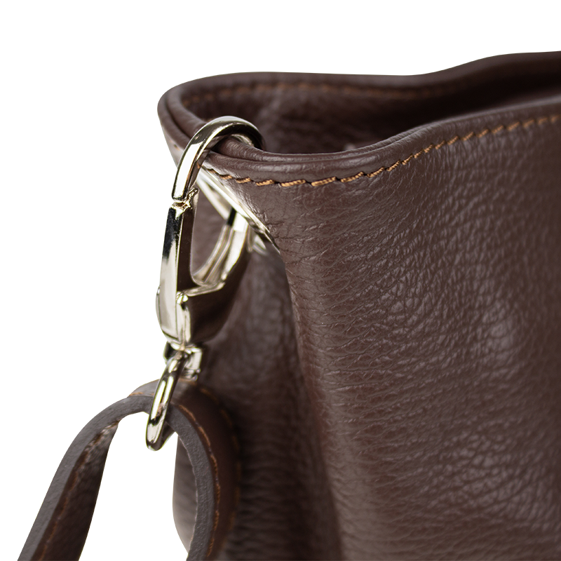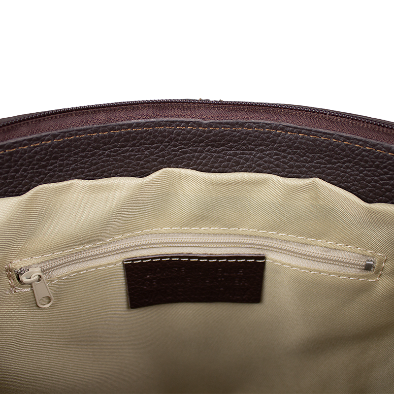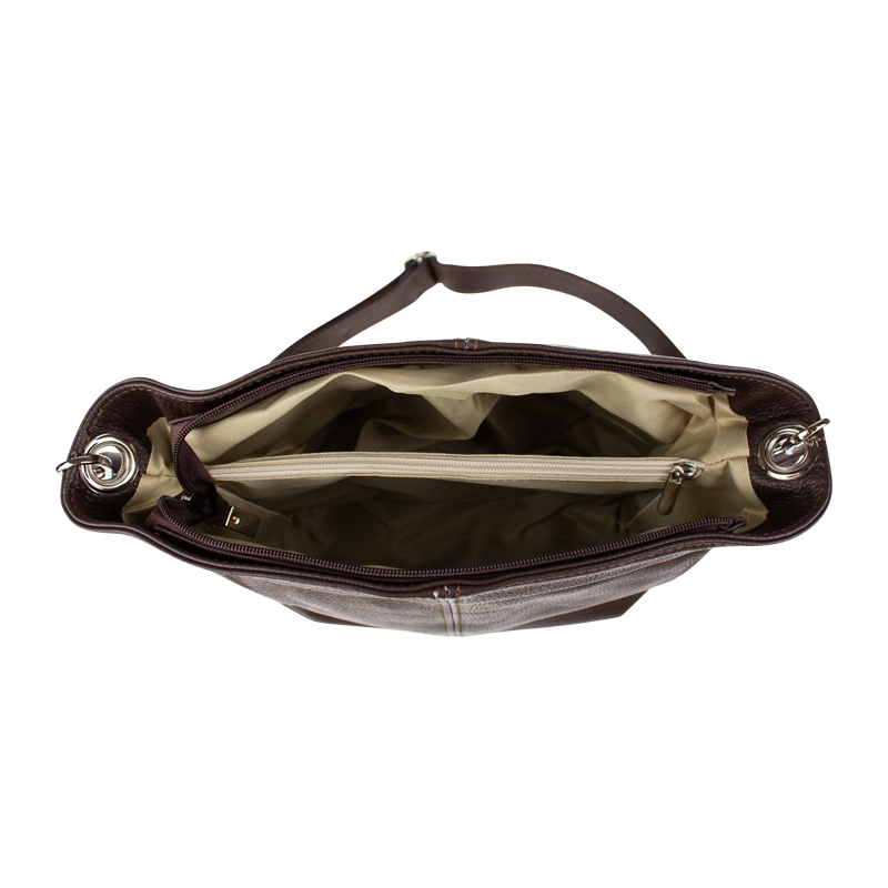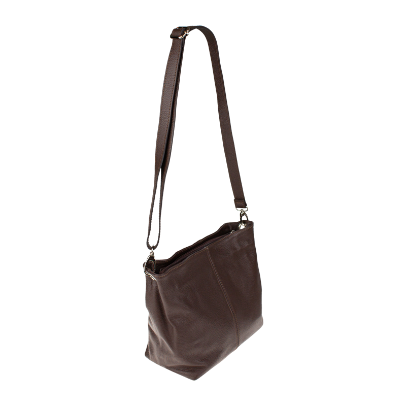 Cafe kabelka nositelná přes rameno či cross-body (křížem). Tato kožená kabelka je uzavíratelná na zip. Uvnitř kabelky najdeme přepážku uprostřed, která zároveň slouží jako kapsa na zip, a na boční stěně pak kapsu na zip. Hloubka jejího dna je 13 cm. Kabelka má navíc nastavitelný popruh s maximální délkou cca 120 cm.