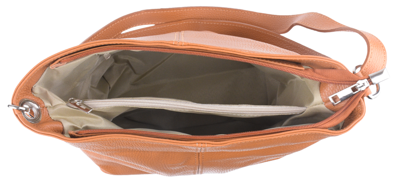 Camel kabelka nositelná přes rameno či cross-body (křížem). Tato kožená kabelka je uzavíratelná na zip. Uvnitř kabelky najdeme přepážku uprostřed, která zároveň slouží jako kapsa na zip, a na boční stěně pak kapsu na zip. Hloubka jejího dna je 13 cm. Kabelka má navíc nastavitelný popruh s maximální délkou cca 120 cm.