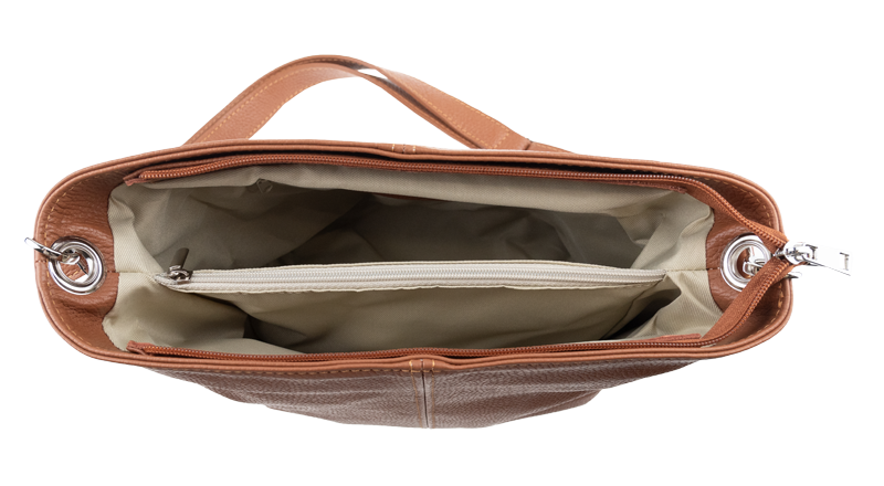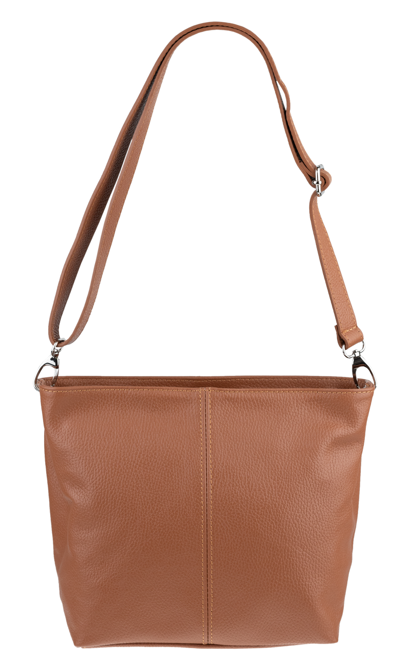 Camel kabelka nositelná přes rameno či cross-body (křížem). Tato kožená kabelka je uzavíratelná na zip. Uvnitř kabelky najdeme přepážku uprostřed, která zároveň slouží jako kapsa na zip, a na boční stěně pak kapsu na zip. Hloubka jejího dna je 13 cm. Kabelka má navíc nastavitelný popruh s maximální délkou cca 120 cm.