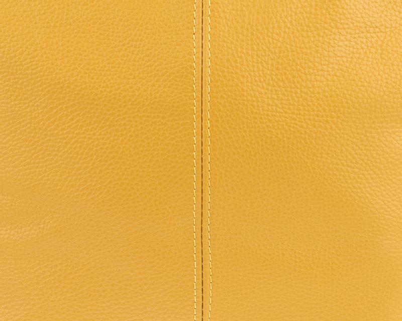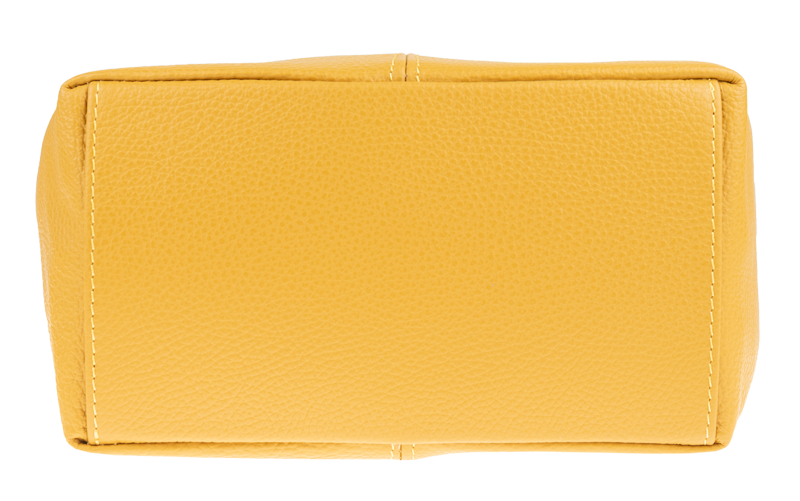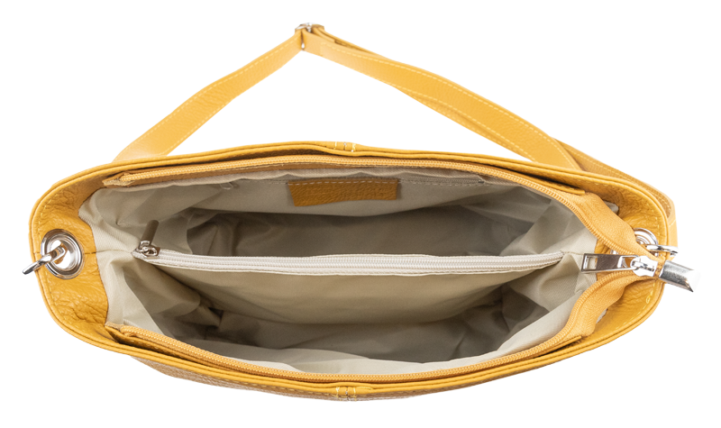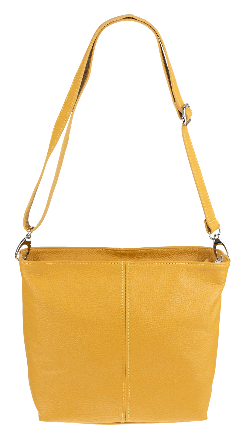 Žlutá kabelka nositelná přes rameno či cross-body (křížem). Tato kožená kabelka je uzavíratelná na zip. Uvnitř kabelky najdeme přepážku uprostřed, která zároveň slouží jako kapsa na zip, a na boční stěně pak kapsu na zip. Hloubka jejího dna je 13 cm. Kabelka má navíc nastavitelný popruh s maximální délkou cca 120 cm.