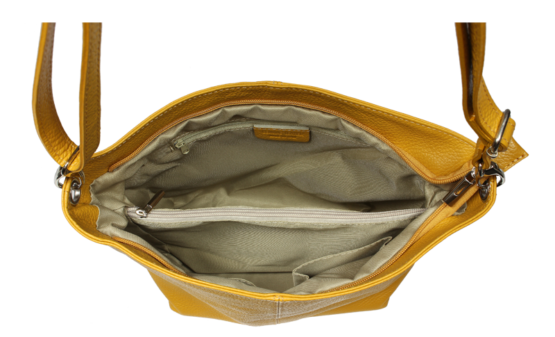 Žlutá kabelka nositelná přes rameno či cross-body (křížem). Tato kožená kabelka je uzavíratelná na zip. Uvnitř kabelky najdeme přepážku uprostřed, která zároveň slouží jako kapsa na zip, a na boční stěně pak kapsu na zip. Hloubka jejího dna je 13 cm. Kabelka má navíc nastavitelný popruh s maximální délkou cca 120 cm.