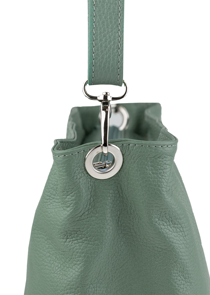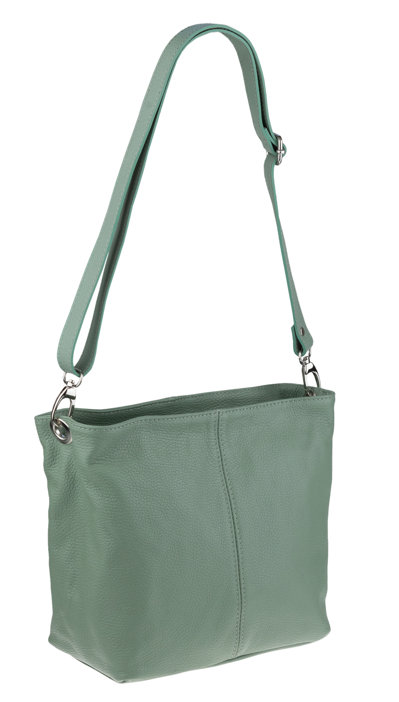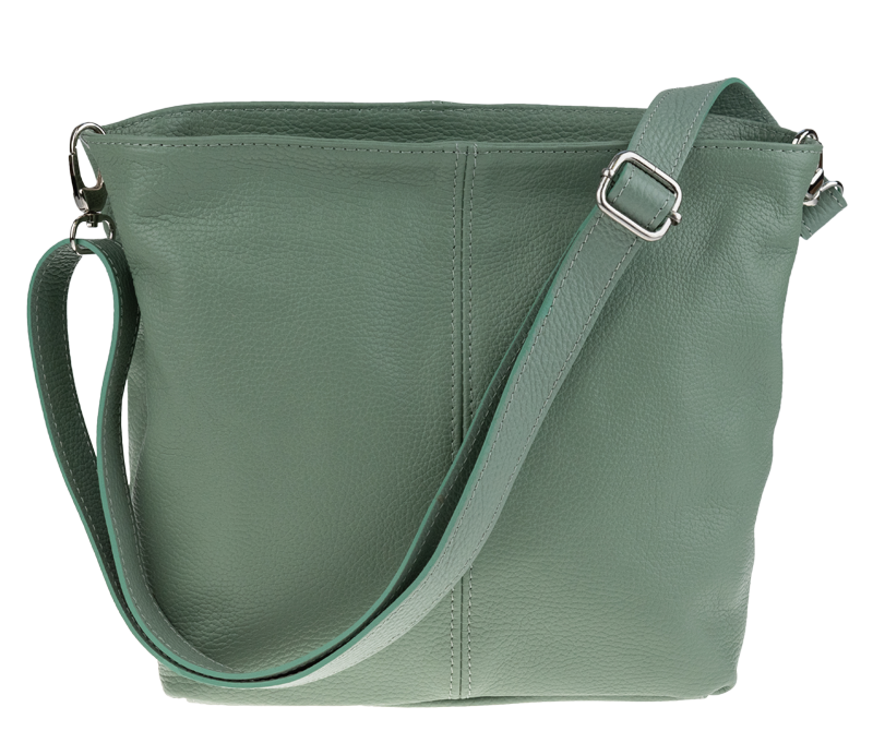 Zelená kabelka nositelná přes rameno či cross-body (křížem). Tato kožená kabelka je uzavíratelná na zip. Uvnitř kabelky najdeme přepážku uprostřed, která zároveň slouží jako kapsa na zip, a na boční stěně pak kapsu na zip. Hloubka jejího dna je 13 cm.