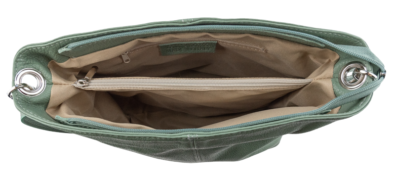 Zelená kabelka nositelná přes rameno či cross-body (křížem). Tato kožená kabelka je uzavíratelná na zip. Uvnitř kabelky najdeme přepážku uprostřed, která zároveň slouží jako kapsa na zip, a na boční stěně pak kapsu na zip. Hloubka jejího dna je 13 cm.