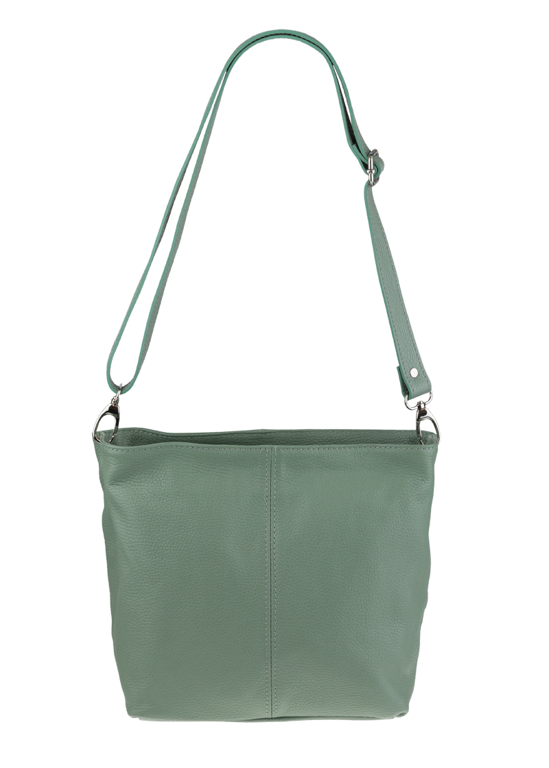Zelená kabelka nositelná přes rameno či cross-body (křížem). Tato kožená kabelka je uzavíratelná na zip. Uvnitř kabelky najdeme přepážku uprostřed, která zároveň slouží jako kapsa na zip, a na boční stěně pak kapsu na zip. Hloubka jejího dna je 13 cm.