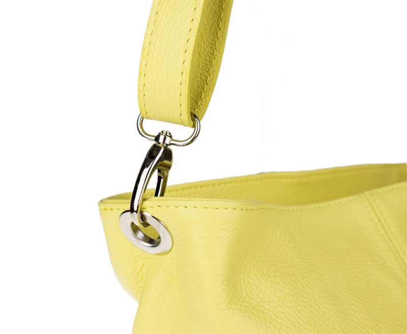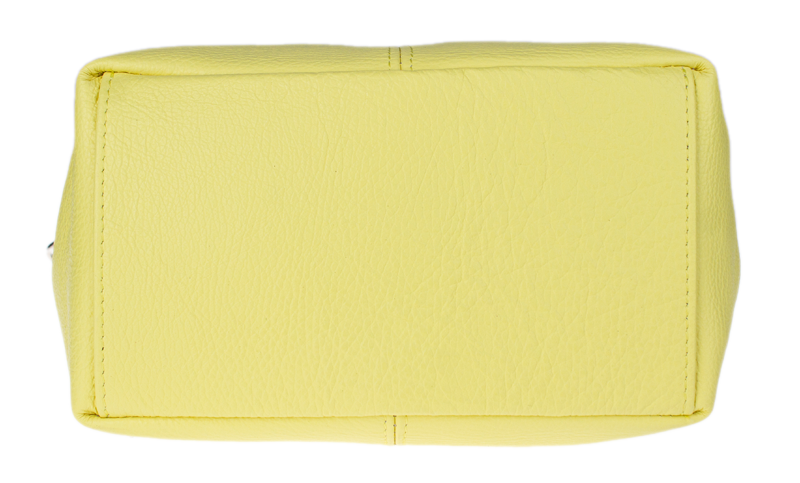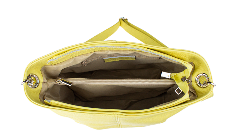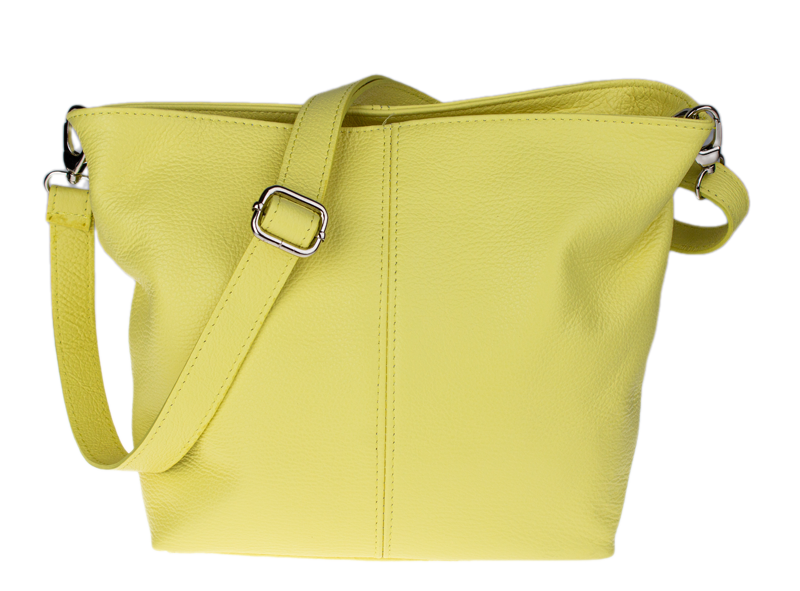 Žlutá kabelka nositelná přes rameno či cross-body (křížem). Tato kožená kabelka je uzavíratelná na zip. Uvnitř kabelky najdeme přepážku uprostřed, která zároveň slouží jako kapsa na zip, a na boční stěně pak kapsu na zip. Hloubka jejího dna je 13 cm. Kabelka má navíc nastavitelný popruh s maximální délkou cca 120 cm.