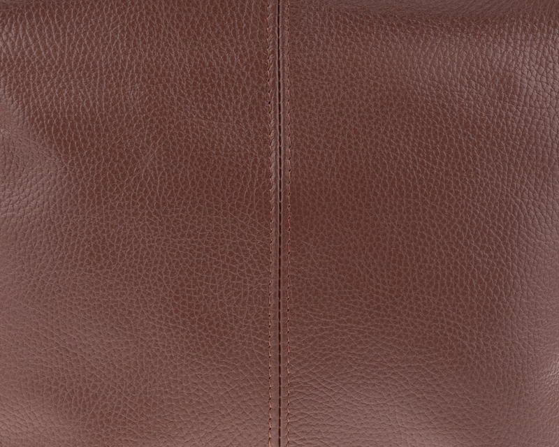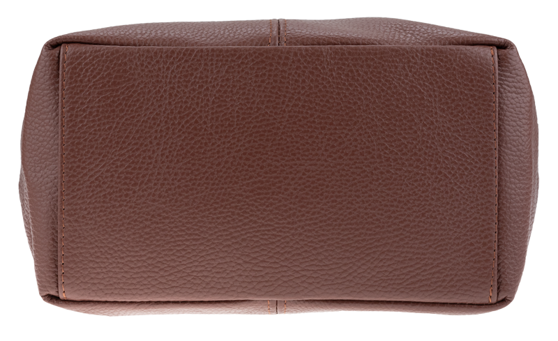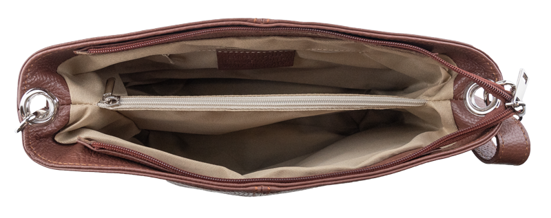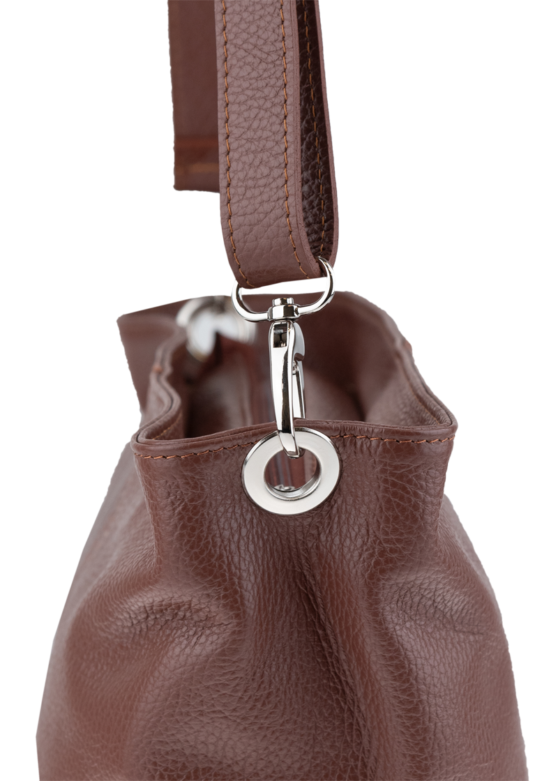 Hnědá kabelka nositelná přes rameno či cross-body (křížem). Tato kožená kabelka je uzavíratelná na zip. Uvnitř kabelky najdeme přepážku uprostřed, která zároveň slouží jako kapsa na zip, a na boční stěně pak kapsu na zip. Hloubka jejího dna je 13 cm. Kabelka má navíc nastavitelný popruh s maximální délkou cca 120 cm.