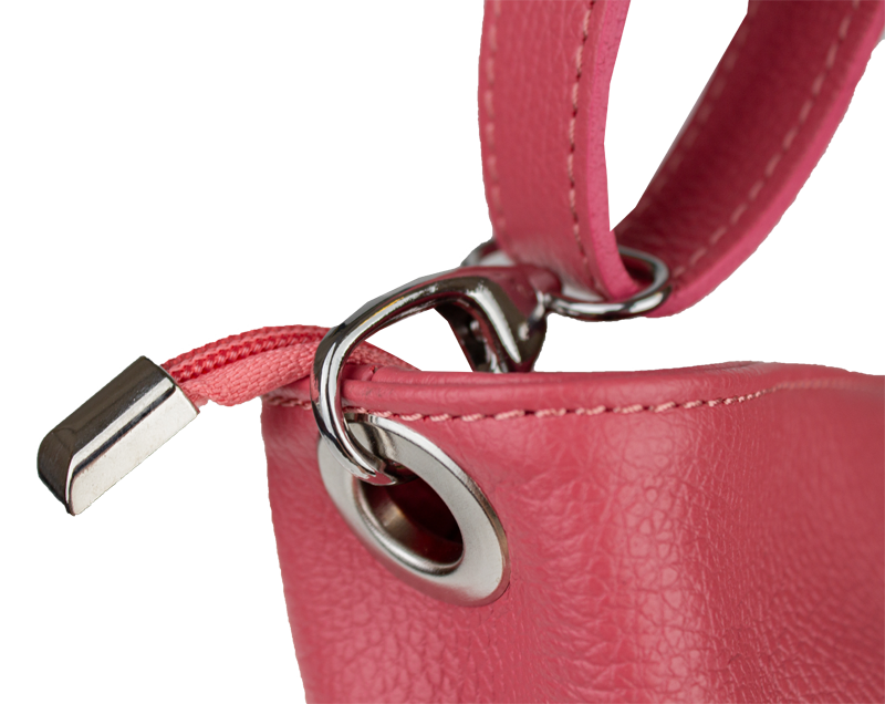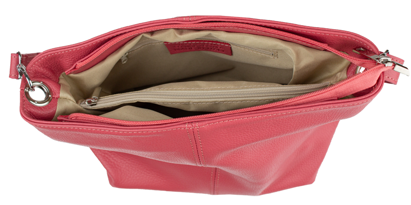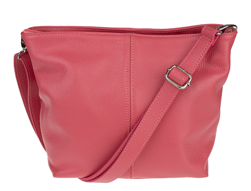 Růžová kabelka nositelná přes rameno či cross-body (křížem). Tato kožená kabelka je uzavíratelná na zip. Uvnitř kabelky najdeme přepážku uprostřed, která zároveň slouží jako kapsa na zip, a na boční stěně pak kapsu na zip. Hloubka jejího dna je 13 cm. Kabelka má navíc nastavitelný popruh s maximální délkou cca 120 cm.